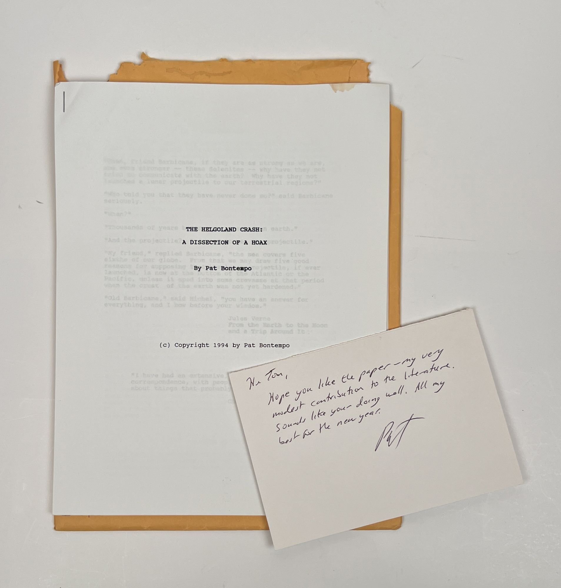 [n.p.]: Pat Bontempo, 1994. First Edition. Staplebound. Very Good. Very Good. Firmly bound with one staple. Pages lightly bumped, a stain and chip at the top edges, clean otherwise. Bontempo's report about the German UFO hoax, a case study in "how misinformation clutters the field, obstructing sound research, and dramatically illuminates the weakness of many investigative efforts in the past." From the collection of ufologist Tom Benson.