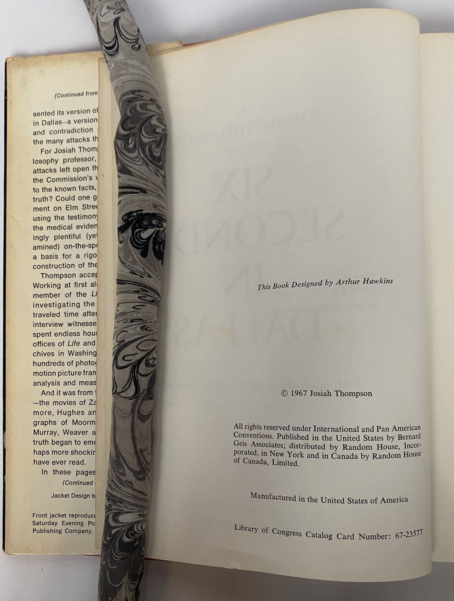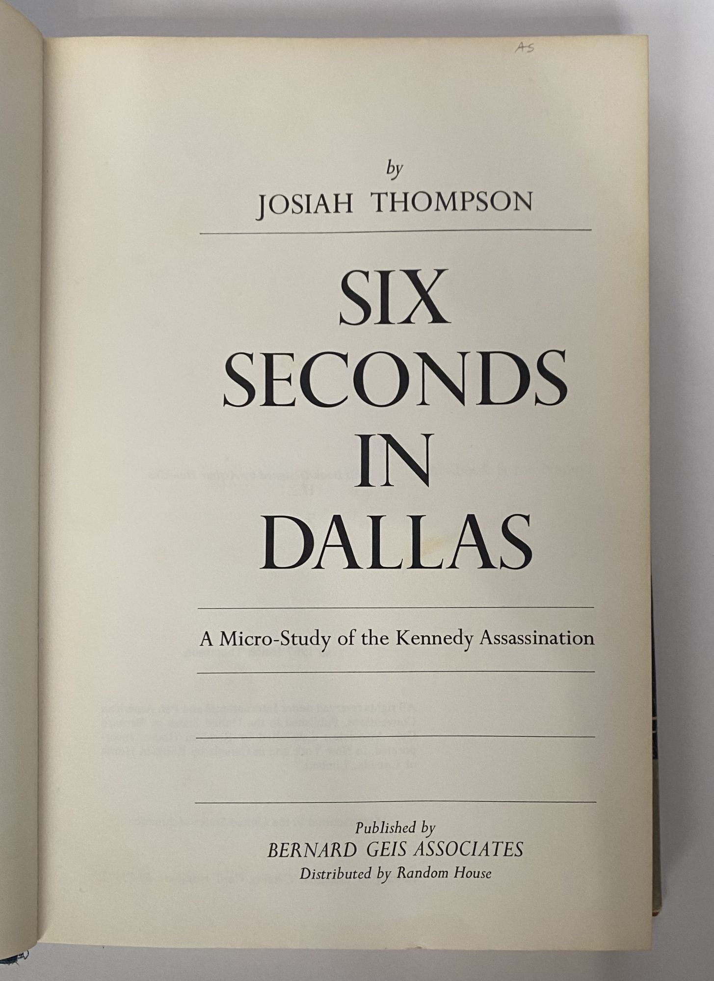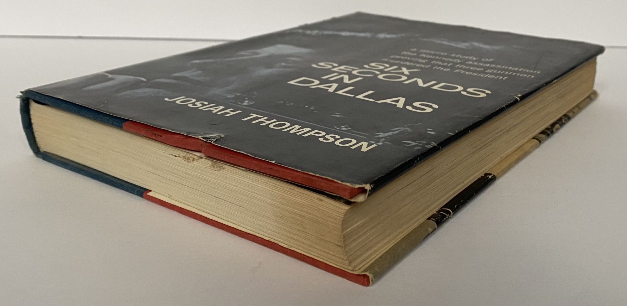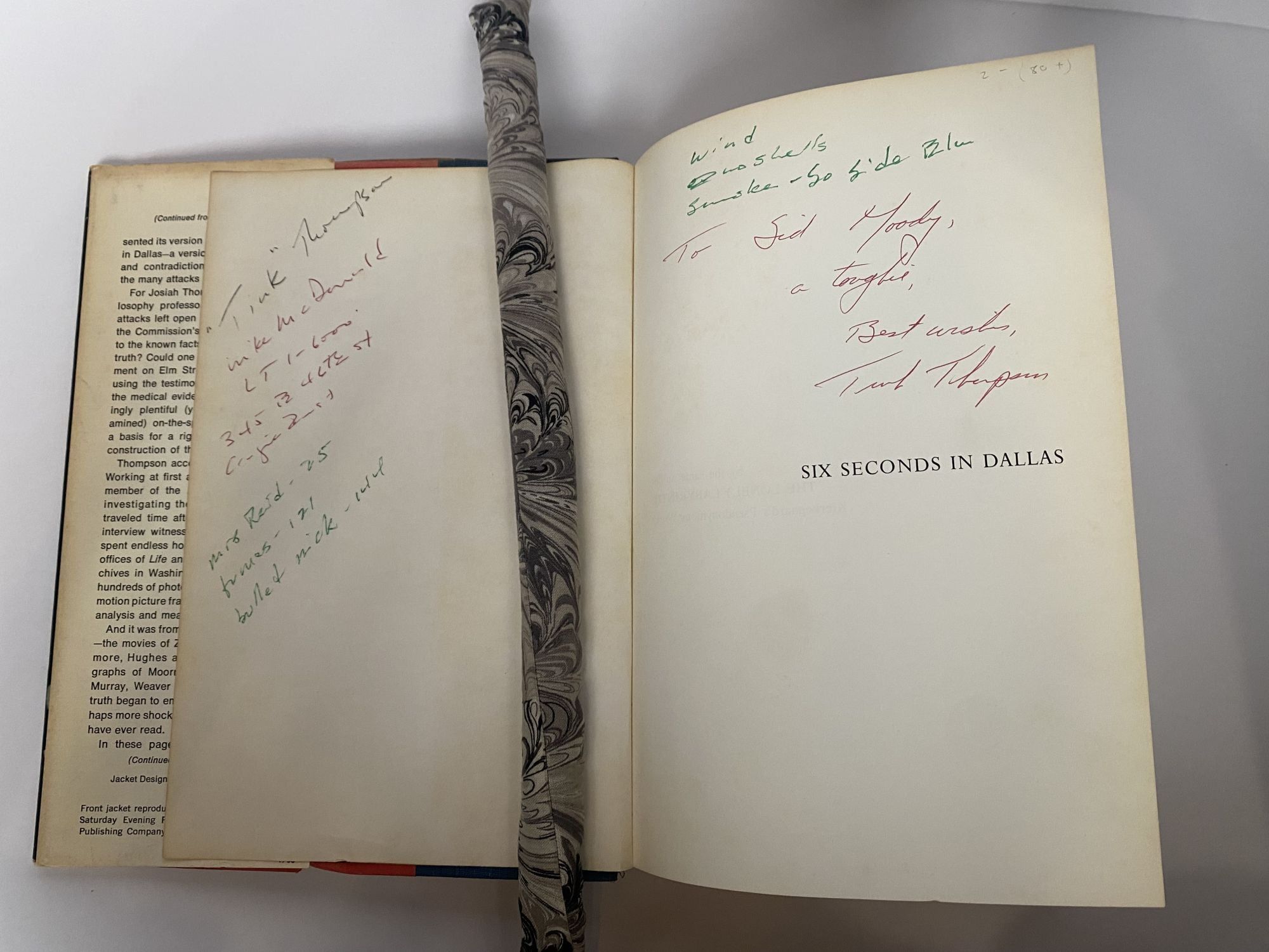 New York, New York: Bernard Geis Associates, 1967. First Edition, First Printing. Hardcover. Octavo, 323 pages. In Very Good condition with Very Good condition dust jacket. Spine is black with white lettering. Dust jacket protected by mylar covering, price uncut: "$8.95" on front flap, has mild age-toning along flaps and rear cover, moderate chipping, tearing, and creasing along extremities including a closed ~1in. on spine tail. Boards have mild shelving wear along spine head and tail, bumping to fore corners, moderate denting and creasing along front tail edge, and has ~1.5in. split along front tail joint. Textblock edges have mild age-toning and soiling, moderate dust-burning along head edge. Interior annotated sparsely throughout by Sid Moody and an unidentified previous owner. Inscribed "To Sid Moody, a toughie, best wishes" on front free endpaper by Josiah "Tink" Thompson. Shelved in Case 1 1/2. Sid Moody (1929-1983) was the Associated Press featured writer responsible for coverage on the Kennedy assassination, whom retired private investigator Josiah "Tink" Thompson worked closely with on the research for SIX SECONDS IN DALLAS: A MICRO-STUDY OF THE KENNEDY ASSASSINATION PROVING THAT THREE GUNMEN MURDERED THE PRESIDENT. Annotations contain multiple references to Mrs. R.A. Reid, a witness in the assassination investigation who reported seeing Lee Harvey Oswald flee the scene. 1407266. Shelved Dupont Bookstore.