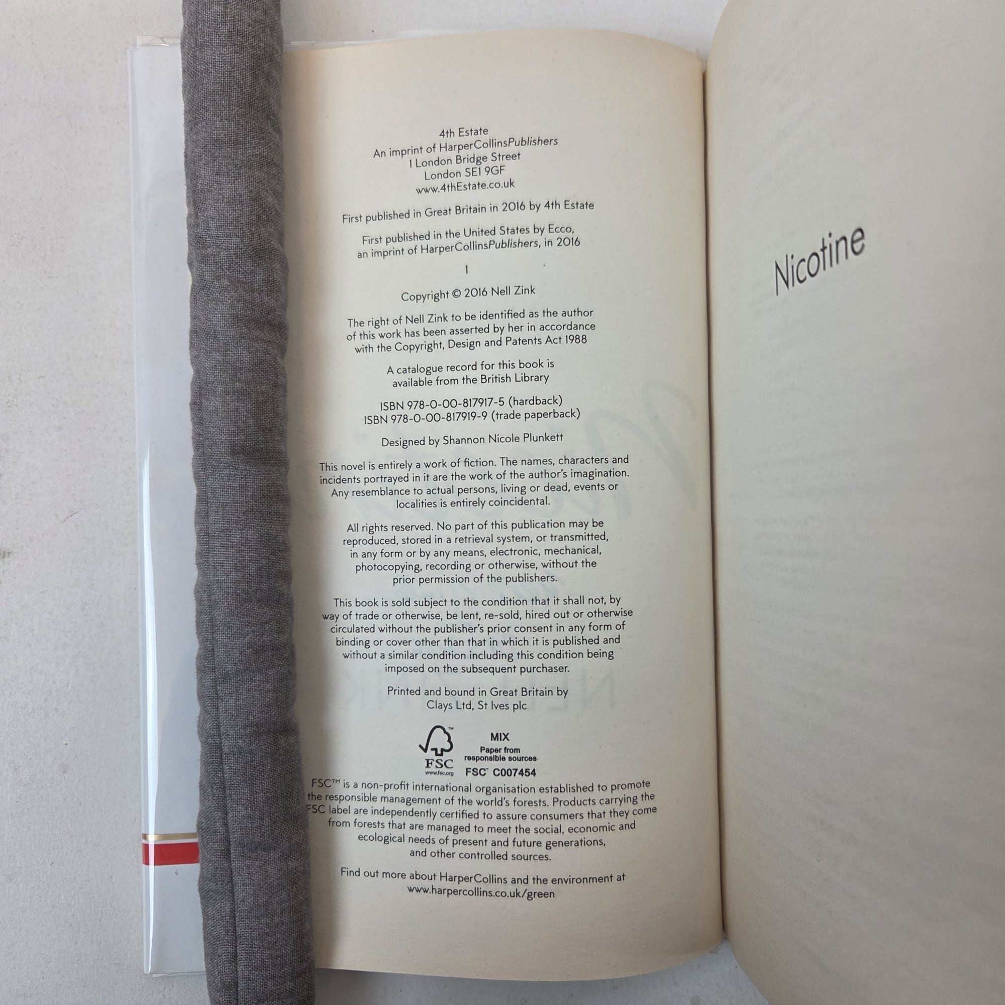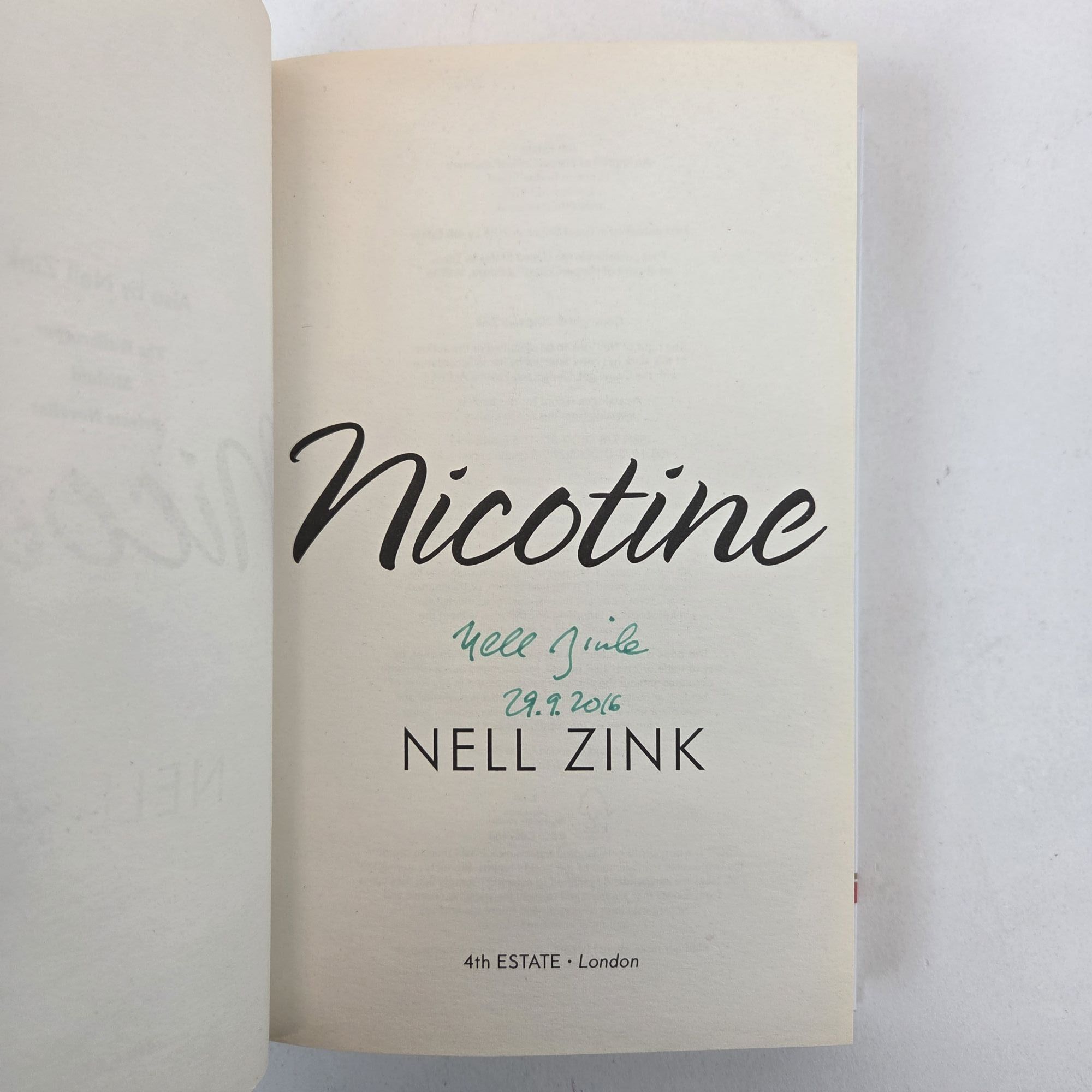 London: 4th Estate, 2016. First Edition, First Printing. Hardcover. Octavo, 288 pages. In Very Good condition with a Very Good condition dust jacket. Spine red and white with white and gold lettering. Dust jacket has crease to top of front flap, protected in mylar covering, price uncut: "£14.99". Boards full bound in white cloth with mild bumping to head and tail of spine. Text block has very mild age-toning to exterior edges. Signed by Nell Zink and dated "29.9.2016"to title page. Shelved in Room B. 1407267. Special Collections.