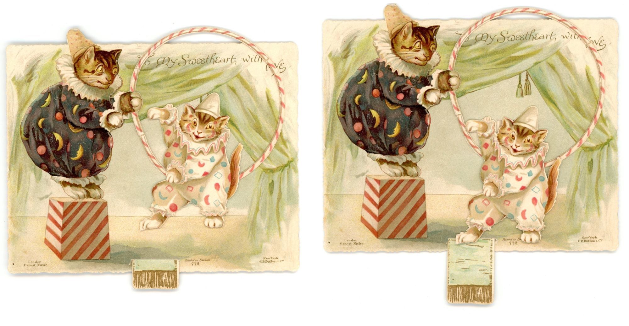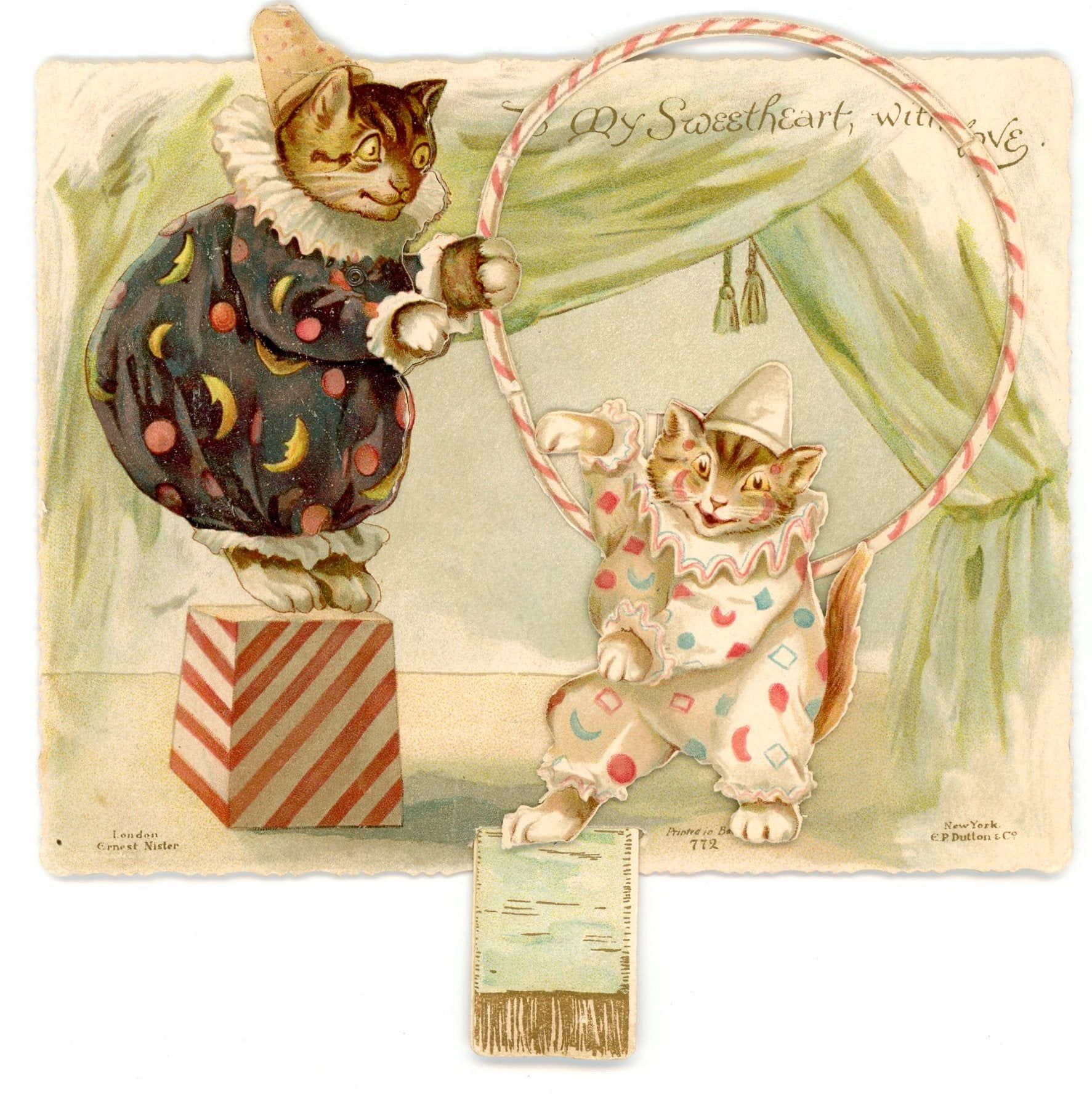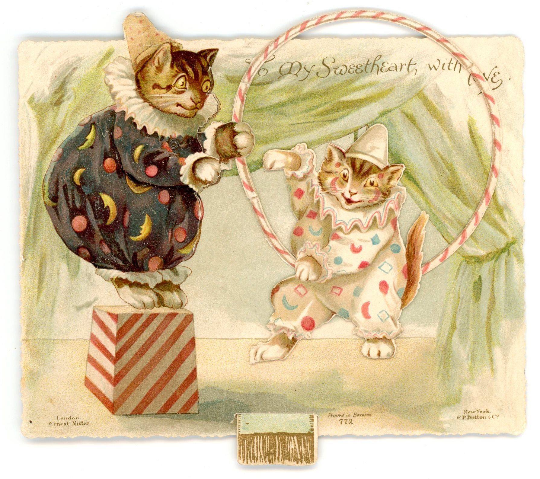London & New York: Nister & Dutton, 1910. Light wear.. A heavy card stock chromolithograph die-cut card with two (2) circus cats - one standing on a block with a hinged arm holding a hop. When the tab at base is pulled downward, the arm moves the hoop up and down as the cat appears to jump. Captioned "To My Sweetheart, with Love". Printed in Bavaria. 772. Measures 4/5" by 5/5