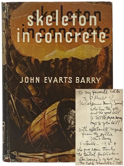 London / Gateshead on Tyne: Gifford / The Thriller Book Club / Northumberland Press Limited, 1953. Hard Cover. Very Good/Very Good. 0x0x0. Signed by author. Inscribed to the author's editor (at length!) and signed on front endpaper ('To my favorite editor J.P. Hall of the California Mining Journal who has the guts and the good will to tell the paper money bags to go to hell! With affection regards from the author John E. (Evarts) Barry, Victorville - 1954, who once again thanks the British publishers after America's gave me the cold shoulder! JEB'). Ink note on front endpaper states 'These books not on sale in America! Sold only in the 'colonies' S. Africa, India, Australia, N. Zealand.' Jacket rubbed with minor loss from spine ends, pages toned. Binding tight and square, text clean and unmarked. 1953 Hard Cover. 256 pp. From the jacket: "Sheriff Bill Hoe and Coroner Slim Blevins, of Biscocho, Vaca County, near the Mexican Border, are up with the police at the long-discussed Gila gold mine, twenty-five miles out in the desert. They have been tipped off that this is where stolen cars have their licence plates, engine numbers, etc., stripped. They have also been tipped off that they may discover evidence of an old murder in the vicinity. During their search inside one of the tunnels leading into the mine they find a deep pool, and when this is drained they discover a skeleton, encased from the waist down, in a barrel of concrete. The skeleton has been there for nearly twenty years. Who was the skeleton and why did he die? This is the problem which Sheriff Hoe has to solve, and his investigations provide a fast-moving, action-filled thriller, with plenty of humour and excellent characters.
