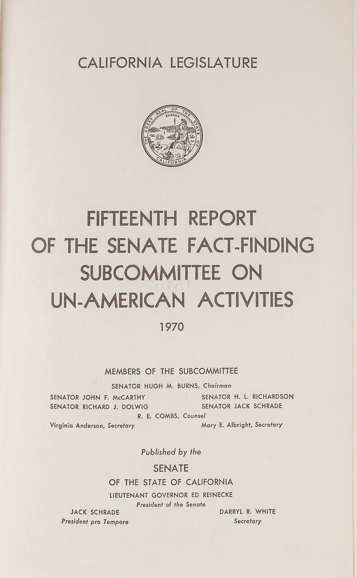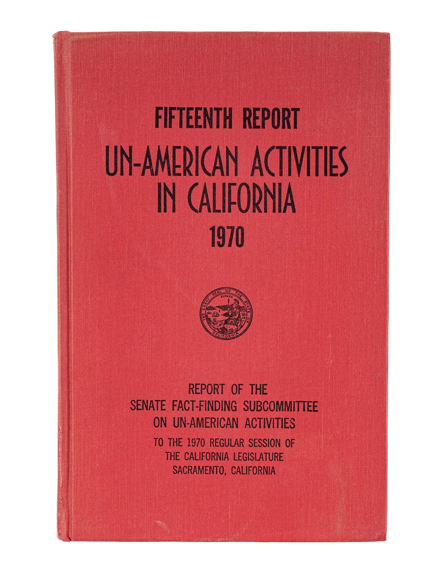 1970. Senate of the State of California. Fifteenth Report of the Senate Fact-Finding Subcommittee on Un-American Activities, 1970. [Sacramento]: [Senate of the State of California], 1970. 299 pp., illustrations. Original red cloth with stamped spine and front cover. Ex-library with location label to foot of spine, bookplate to front pastedown, date due slip to rear free endpaper, card pocket to rear pastedown. Very good. $20.