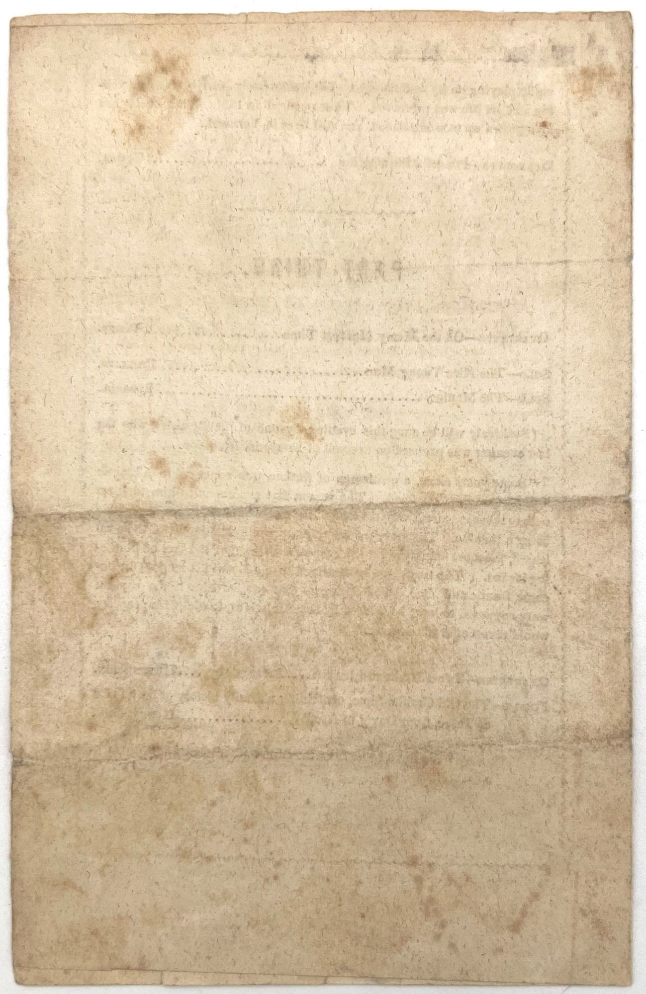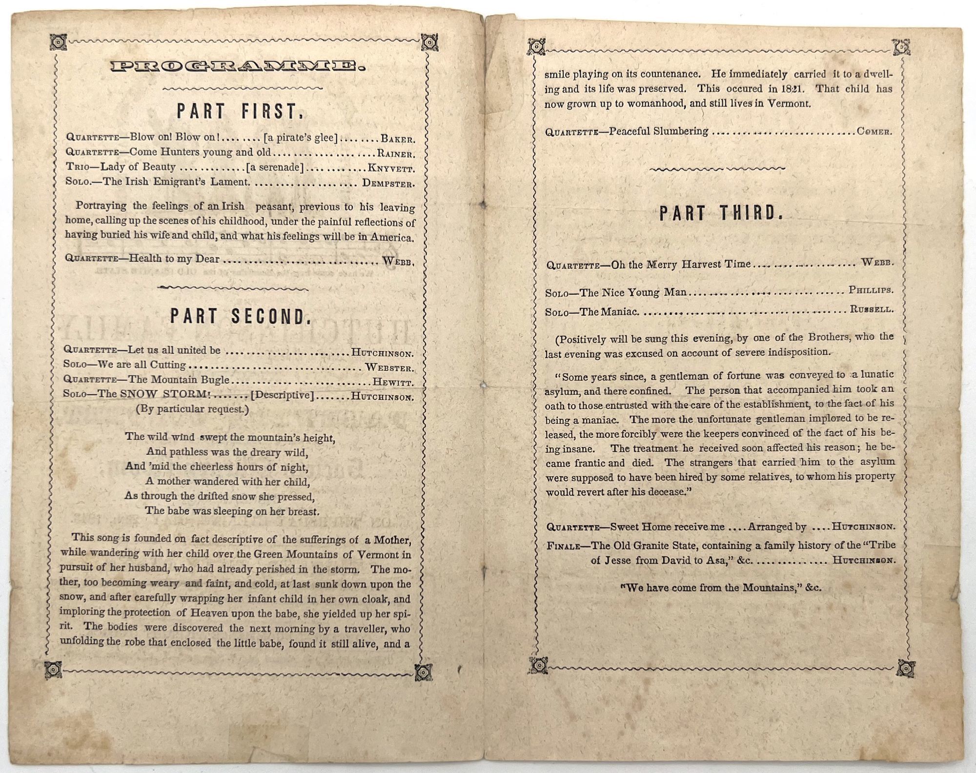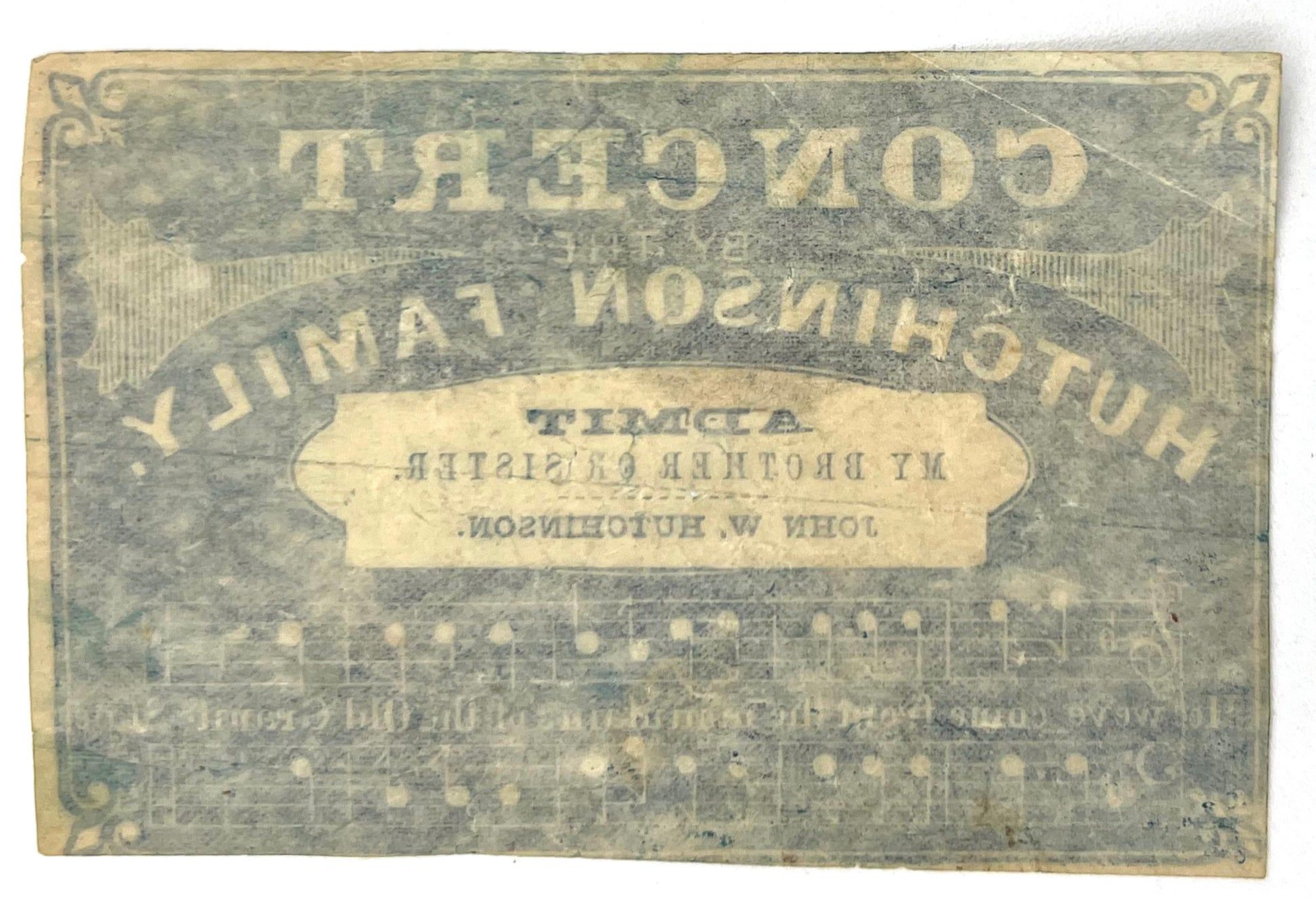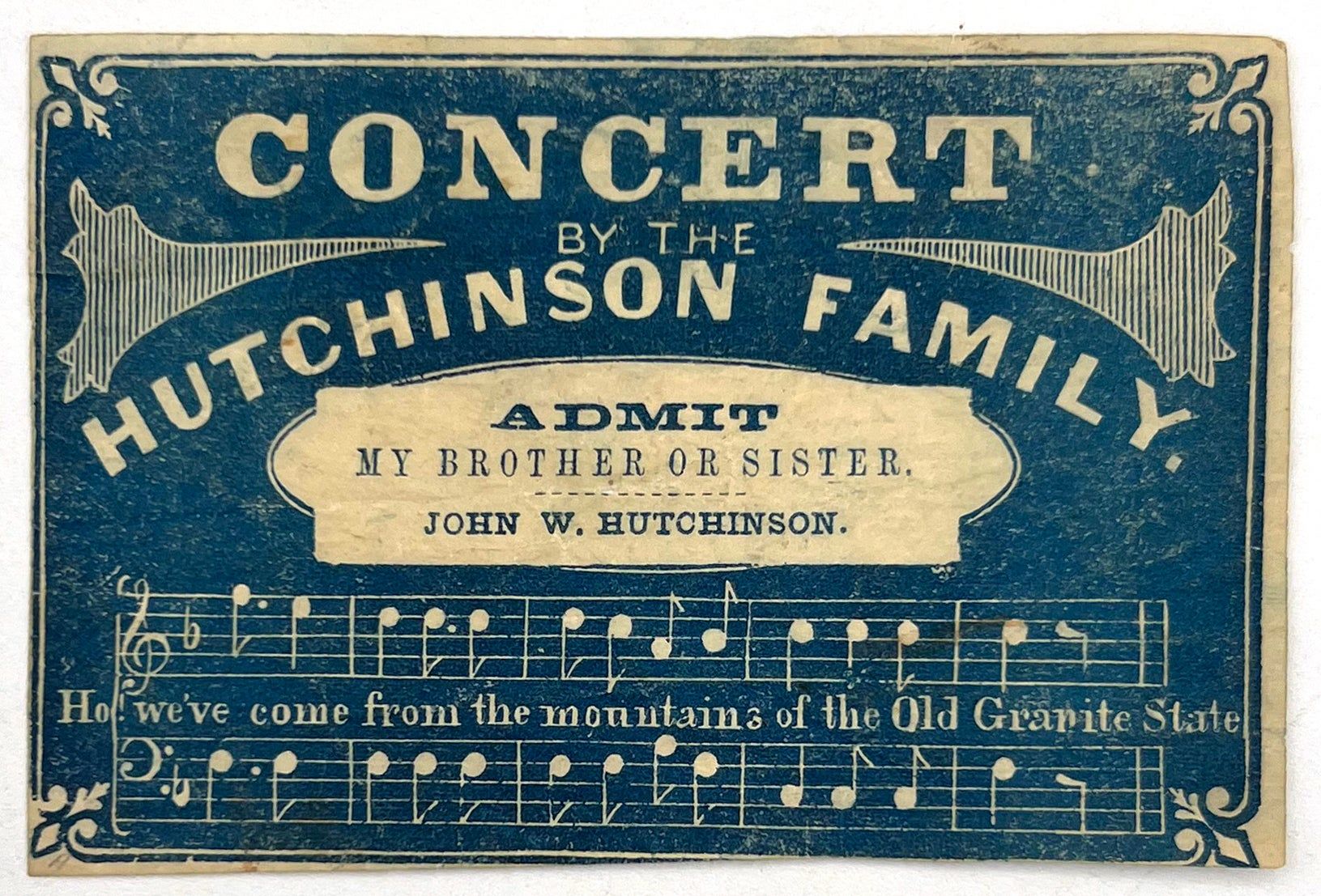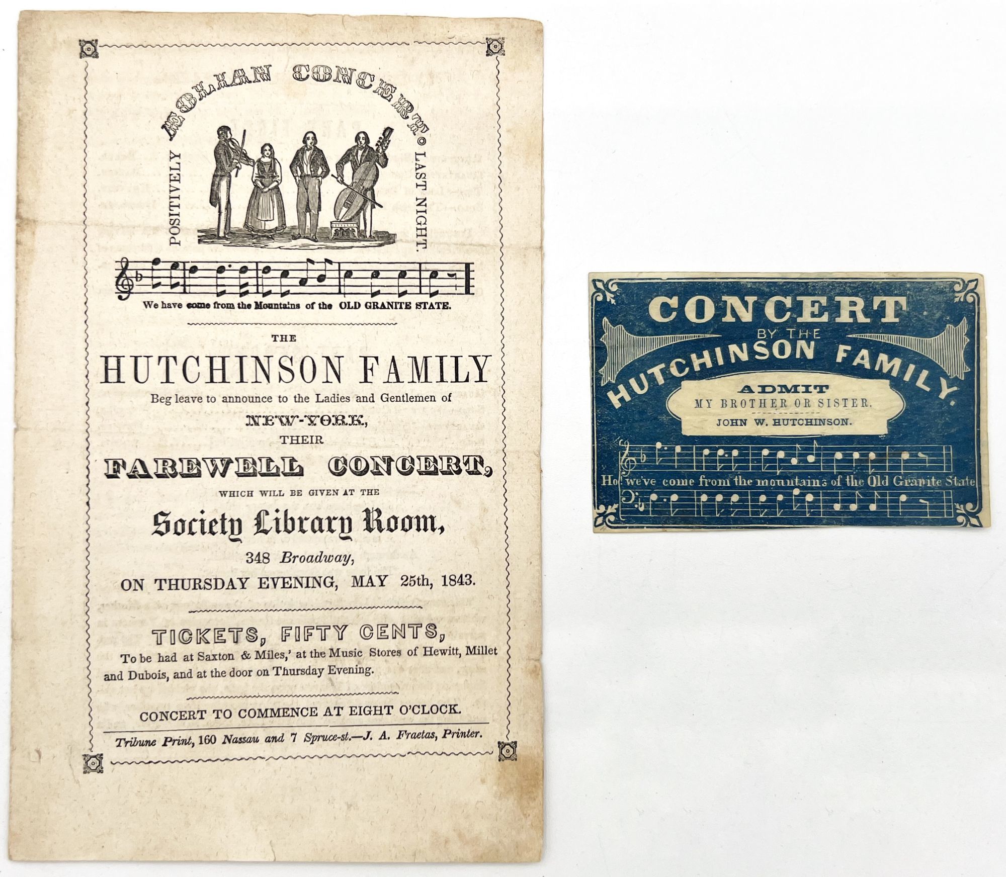 New York, New York: Tribune Print, 1843. Good to very good. Light toning/staining, letter folds, the occasional nick.. A concert program and admit one ticket from an 1843 farewell concert given in New York by the famed Hutchinson Family Singers. The event was held on May 25, 1843 at the Society Library Room, 348 Broadway. The group was tremendously popular at the time, and are notable today for being early performers of what is now known as "American" music-- folk songs and tunes originating from America, rather than high-brow European choral music. They were most known for their original song "The Old Granite State" which referred to their family's roots in New Hampshire. Here, the melody and lyrics are illustrated on both the admit one and the program. Inside is a three-part program of tunes, with three accompanied by lengthy descriptions of the subject matter. Progressive for their time, they became abolitionists and advocated for women's rights. Here, we see them sympathizing with Irish immigrants, who would have been looked down upon by the upper American elite: "[The song portrays] the feelings of an Irish peasant, previous to his leaving home, calling up the scenes of his childhood, under the painful reflections of having buried his wife and child, and what his feelings will be in America". Sentiment and empathy were key to why the group became so popular among general public. Program is a bifolium (7.75" by 4.75"), admit one printed in blue and measures 2.25" by 3.5" Note well the group's attempt to include the audience into their "family"; the admit one reads, "Admit My brother or sister
