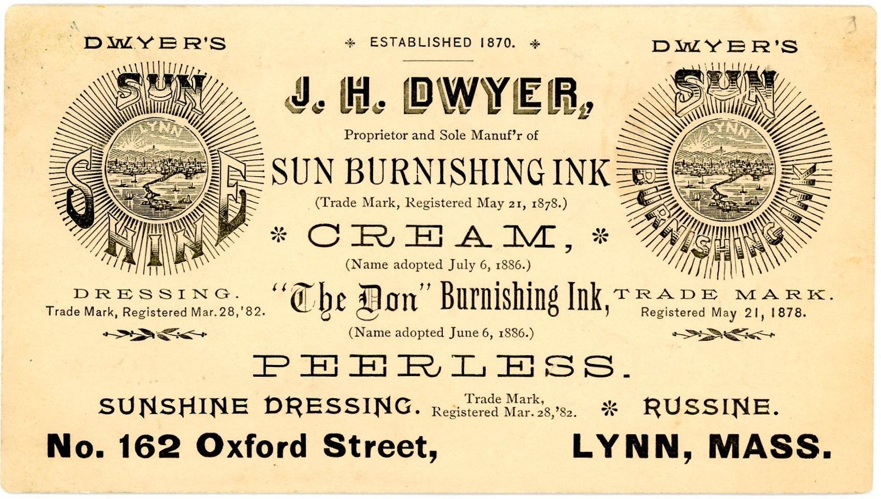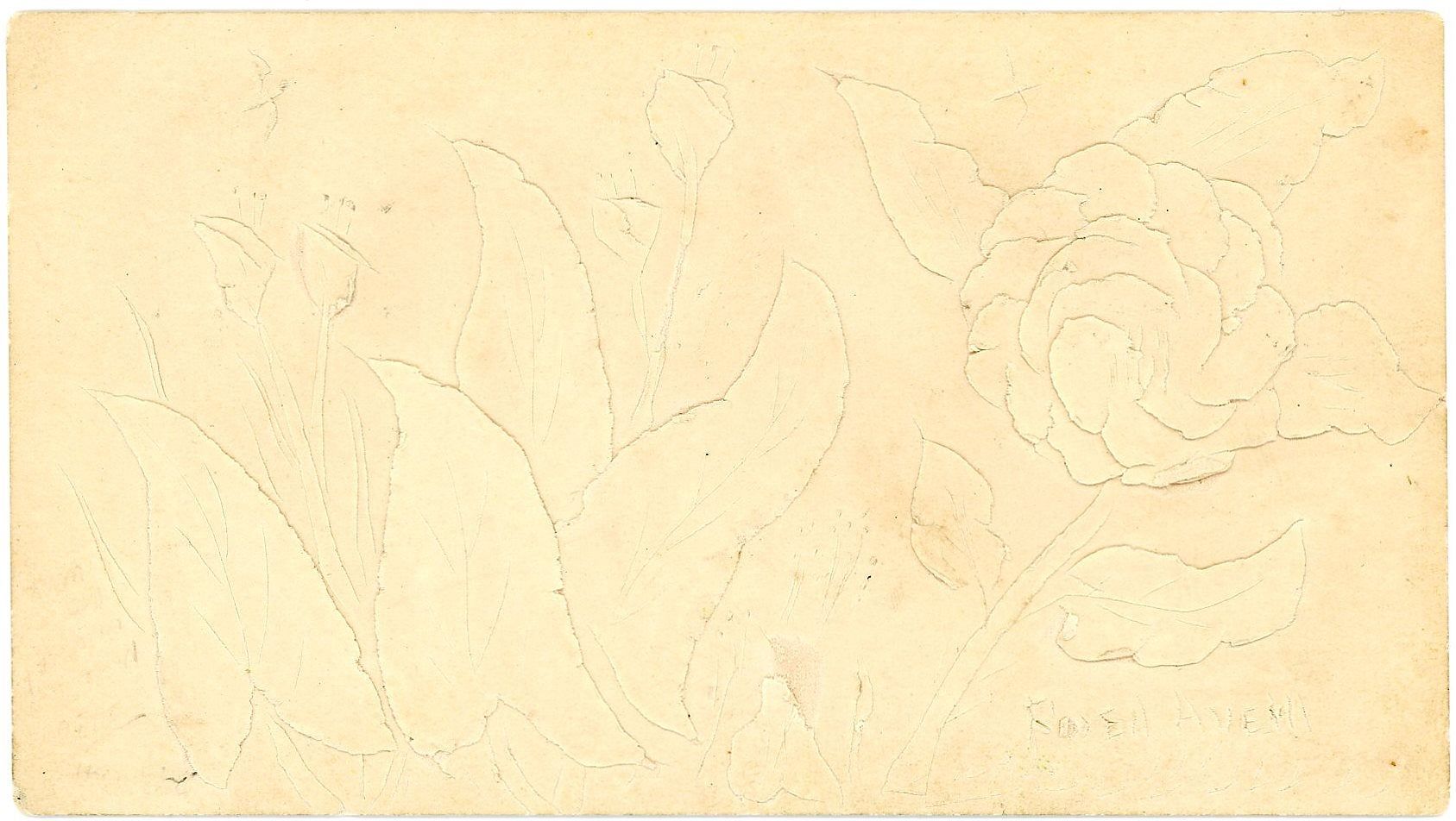 1900. A 3" by 5.5" finely executed razor cut work depicting calla lilies and a rose. Signed by Gwen Aveyll in razor cut. The razor cuts create a raised almost embossed impression. The reverse of the card is an advertisement for J.W. Dwyer, Sun Burnishing Ink Cream, Lynn MA.