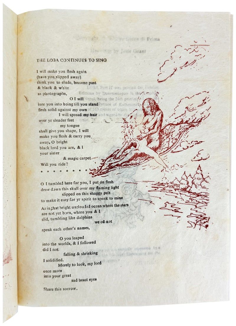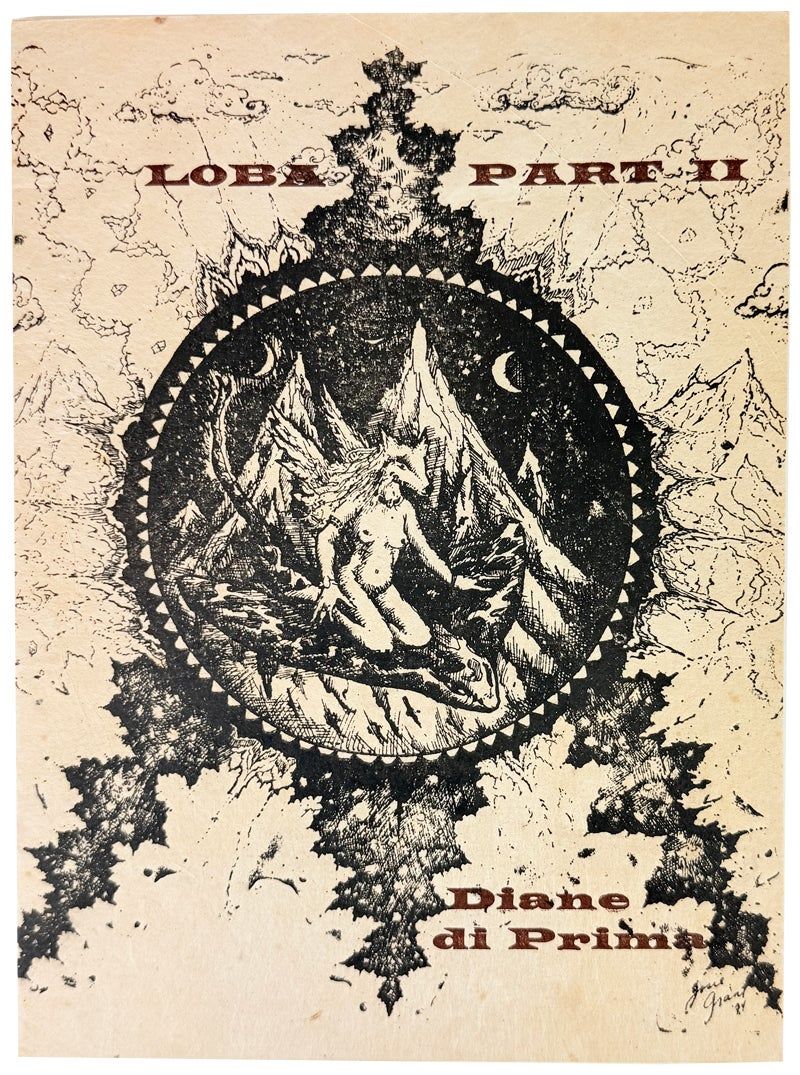 Pt. Reyes, CA & Kathmandu, Nepal: Eidolon Editions, 1976. Very Good. Pt. Reyes, CA & Kathmandu, Nepal: Eidolon Editions, 1976. First Edition, Limited Issue of 550 copies. Octavo; illustrated wraps; [18]ll. printed on rice paper. Illustrations. Mild rubbing and a few stray spots to wraps; binding sound; pages unmarked. A Very Good copy of part II of di Prima's She-wolf centered epic poem.