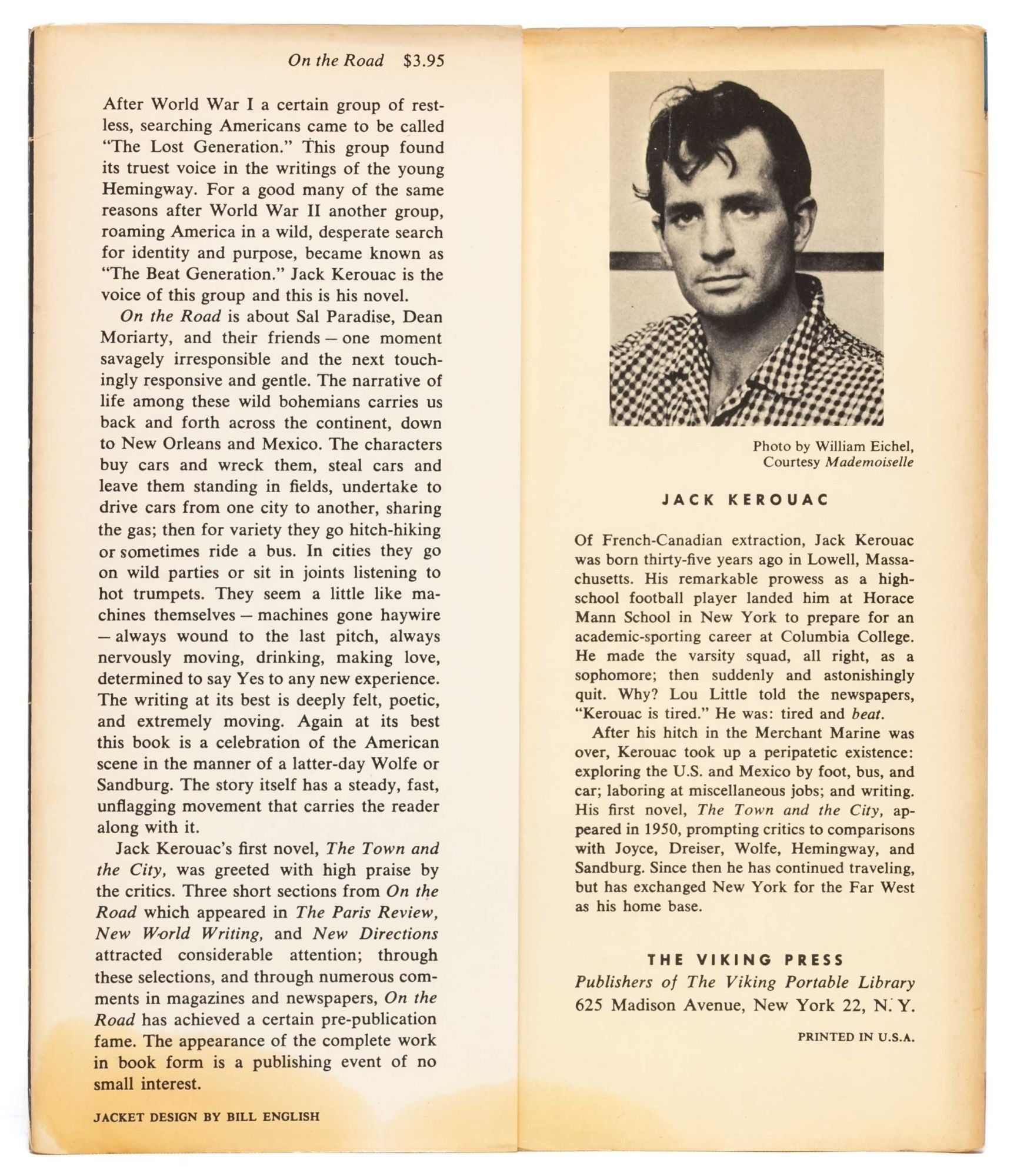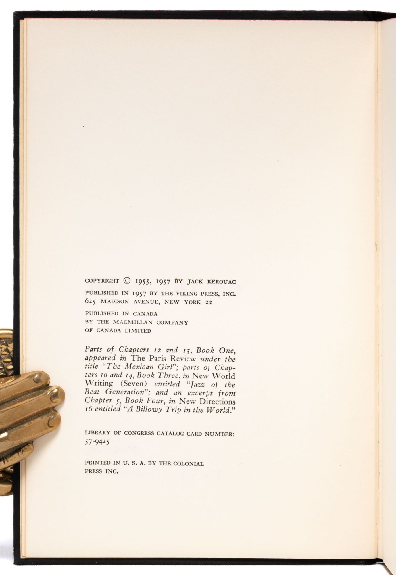 "It changed my life like it changed everyone else's," Bob Dylan said of On The Road. Jack Kerouac’s classic Roman A Clef, published in 1957, was the defining work of the beat generation. It follows the travels of Sal Paradise, a stand in for Kerouac himself, and is based on a series of journeys Kerouac took from 1947 to 1950. The work was typed up on a continuous “scroll” of sheets that Kerouac had taped together. On The Road appears on both Modern Library’s list of the 100 best novels of the century and on Time Magazine list of the 100 best English language novels from 1923-2005. “[I]ts publication is a historic occasion… the most beautifully executed, the clearest and the most important utterance yet made by the generation Kerouac himself named years ago as 'beat,' and whose principal avatar he is” (Contemporary New York Times review). Very Good + in Very Good dust jacket.