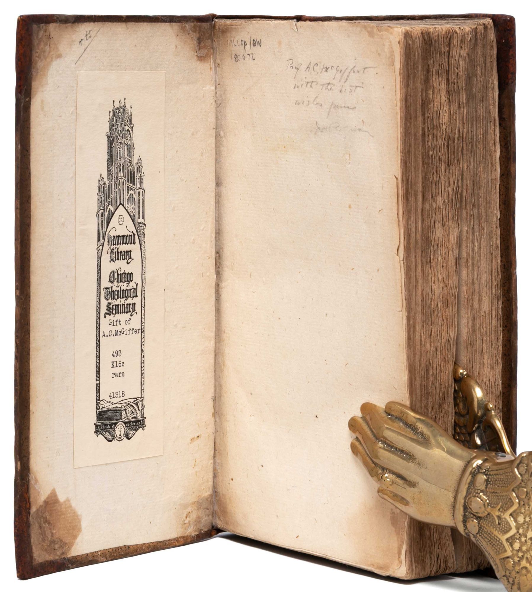 Octavo (215 x 129 mm), pp. [xxiv], 856. Wood-engraved title vignette, wood-engraved initials, head- and tailpieces. Contemporary speckled boards rebacked and recornered in sprinkled sheep, edges uncut. Housed in custom made blue cloth solander box. Contemporary notation to foot of title page; late 19th-century pencil inscription of “J. A. Robinson”, possibly the later Dean of Westminster (1858-1933), presenting this copy to Professor Arthur Cushman McGiffert (1861-1933) on front free endpaper; early 20th-century bookplate of the Chicago Theological Seminary (CTS), recording donation by his son Arthur Cushman McGiffert Jr. (1892-1993), who taught religious thought at the Seminary and red ink number stamp to p. [iii]. Minor foxing and damp-staining to contents, contents partly unopened: a Very Good+, uncut copy.