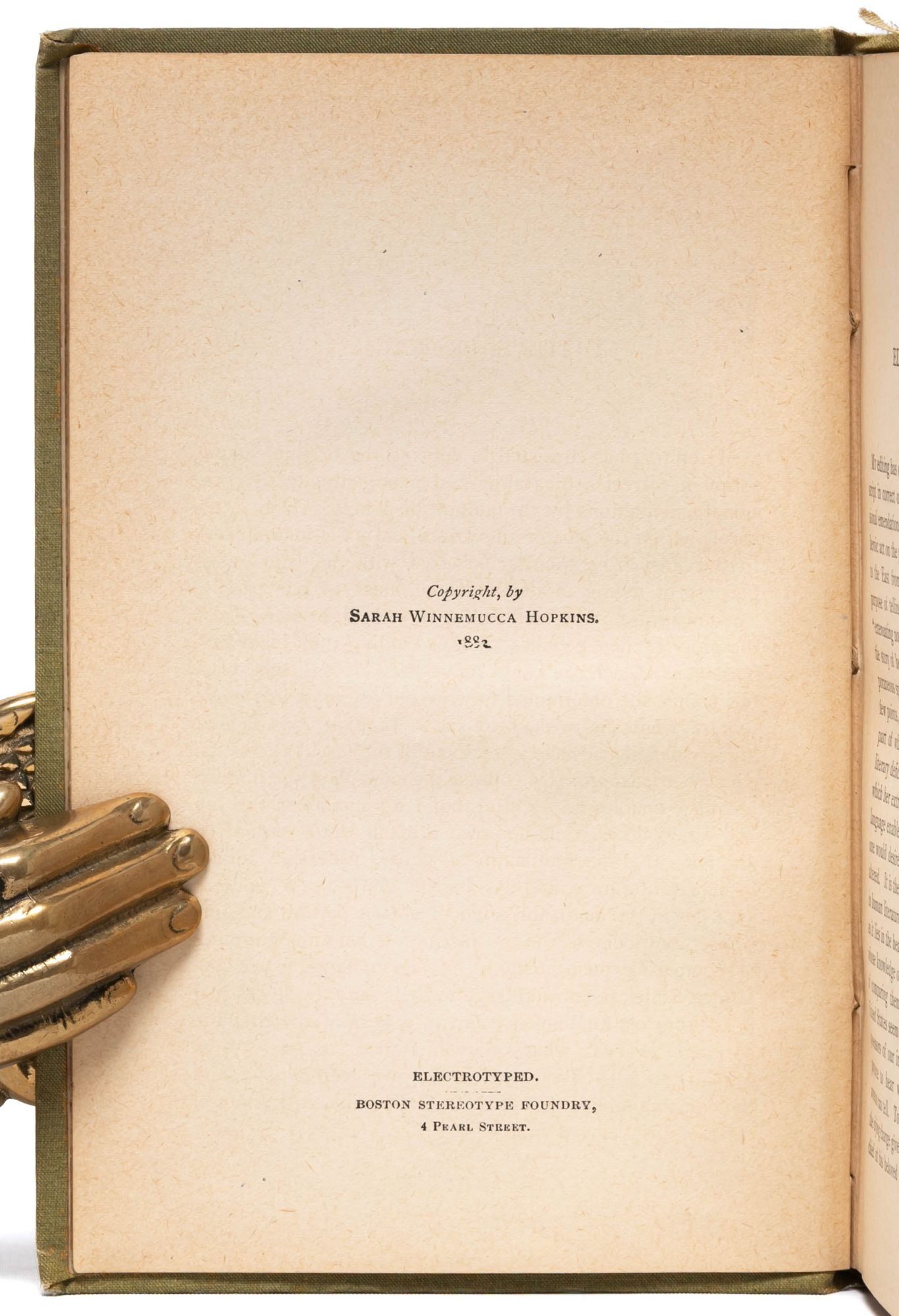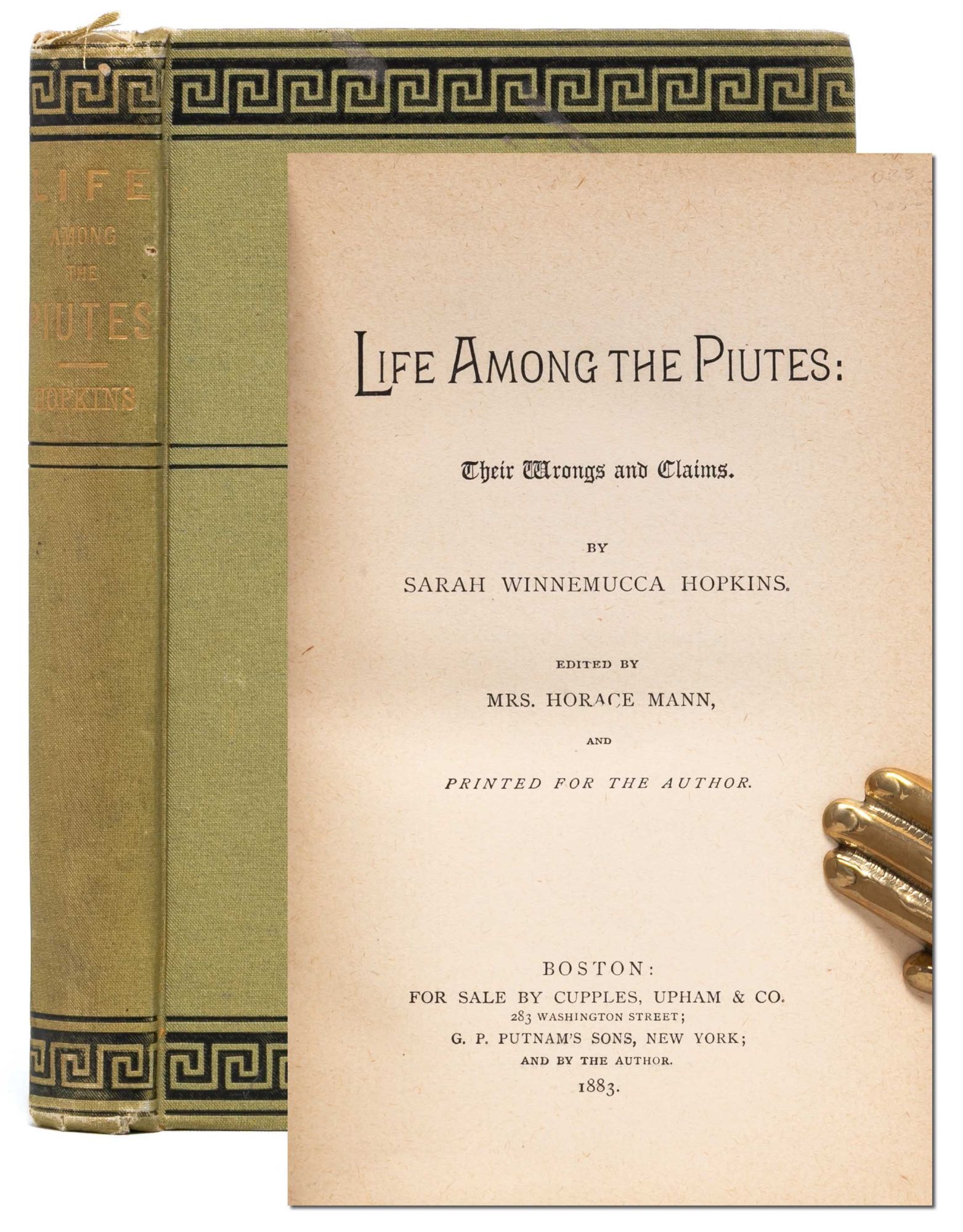 Boston: Printed for the Author...For Sale by Cupples, Upham & Co, 1883. First edition. Very Good. Publisher's green cloth stamped in black and gilt. Some fraying to head and tail of spine. Some dampstaining and contemporary markings to endpapers: 1886 ink ownership signature and two early colored pencil signatures, as well as an American Merchant Marine Library (Boston, MA) stamp. Otherwise, clean throughout. A Very Good copy of a scarce book, the first autobiography of a Native woman published in English and the first example of a Native woman securing copyright registration in the United States.