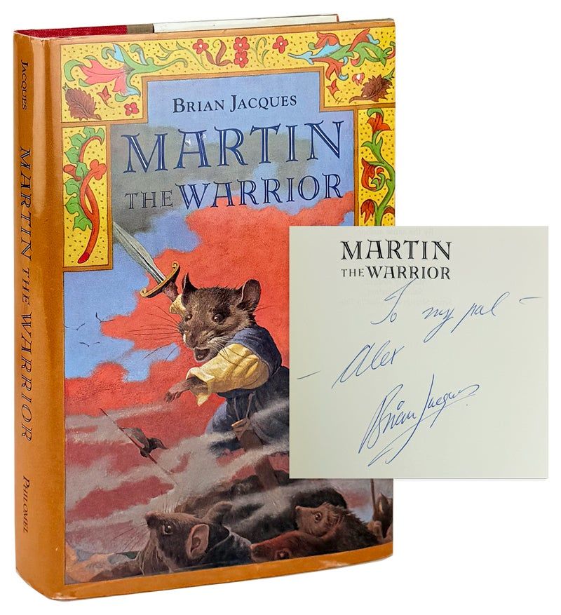 New York: Philomel Books, 1993. Near Fine/Very Good +. New York: Philomel Books, 1993. First Edition. Signed by Brian Jacques at half title with brief inscription to previous owner. Large octavo; illustrated dust jacket; red cloth-backed boards; 376pp. Unclipped dust jacket rubbed along edges with a couple chips to front panel. Boards show very light shelfwear; binding sound; pages unmarked; Near Fine in a Very Good or better dust jacket.