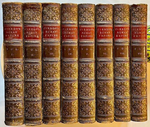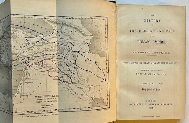 London: John Murray, 1862. Full leather. Very Good +. The handsome 1862 John Murray edition, complete in 8 octavo volumes, all lavishly bound in a sumptuous, full dark-green leather. With gilt-bordering along the panels, finely gilt-tooled compartments and bright gilt-titling along the spines. Very minor wear to several of the outer hinges and spine ends, light scuffing to a number of the panels. Armorial, contemorary-to-the-period bookplate ("Frederick John Walker") at each front pastedown. Lovely marbled edges and endsheets, large fold-out map as well ("A Map of the Eastern Part of the Roman Empire") at the rear of Vol. I. From the "Preface by the Editor" (William Smith, L.L.D.): "This edition of the 'History of the Decline and Fall of the Roman Empire' is distinguished by a correct text, the verification of the references to ancient writers, and corrective and supplementary notes.