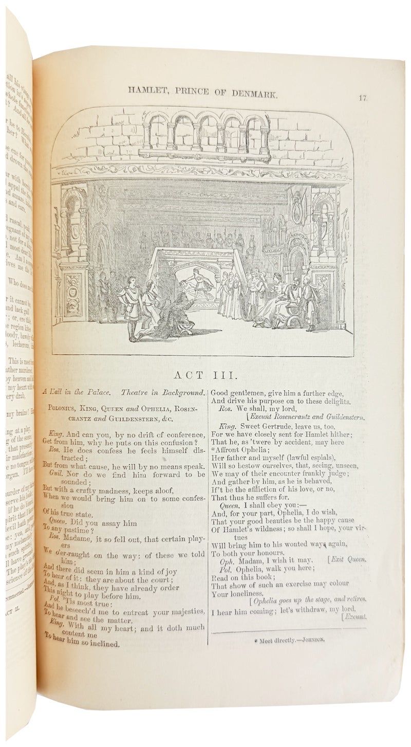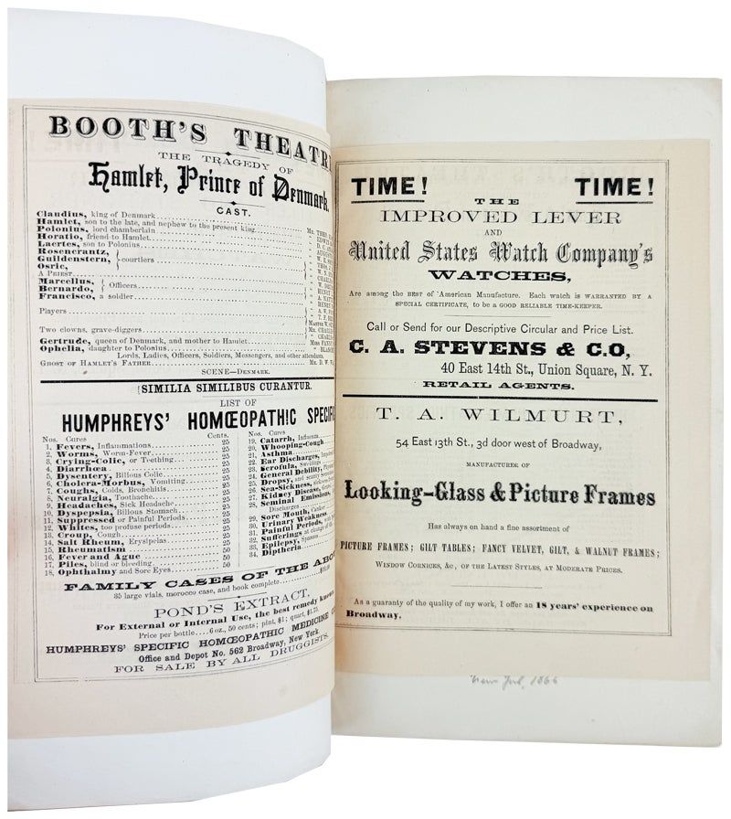 Scarce edition of Hamlet issued in conjunction with the 100th consecutive performance of Edwin Booth in the titular role at the Winter Garden in New York. The upper cover is adorned with a portrait of a very contemplative Booth dressed for the role executed by the firm J.S. Davis & Speer. Just a year earlier his younger brother John Wilkes Booth assassinated Abraham Lincoln and was hanged two weeks later.
