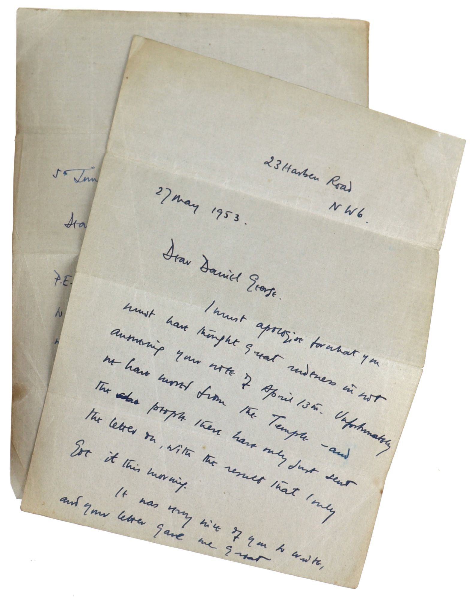 Two handwritten signed letters from author John Mortimer laid-in. Both are addressed to a "Daniel George," likely Daniel George Bunting who was an editor for the publisher Jonathan Cape at the time. Mortimer's letter dated 27 May 1953 states: "It was very nice of you to write, and your letter gave me great pleasure, as did the kind review I have read in the 'Book Man'. I am naturally very excited about the Book Society Choice and hope the book is good enough for it.