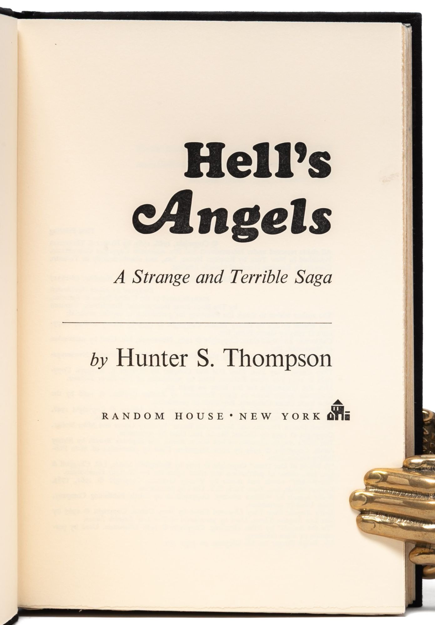 A contemporary New York Times review called Hunter S. Thompson's first foray into gonzo journalism "a portrayal of a world most of us would never dare encounter." Still considered one of the finest examples of immersion journalism, Hell's Angels takes readers deep into the much-feared motorcycle gang; this was a move made possible when Thompson was introduced into the gang by Birney Jarvis, a former club member turned police-beat reporter in San Francisco. With entre to the club, Thompson was able to get close to members in a way no outsider had before, and members became increasingly open to having the author record their experiences across the year he spent with them. Ultimately, Thompson himself commented that he "was no longer sure whether I was doing research on the Hell's Angels or being slowly absorbed by them." Near Fine in Near Fine dust jacket.