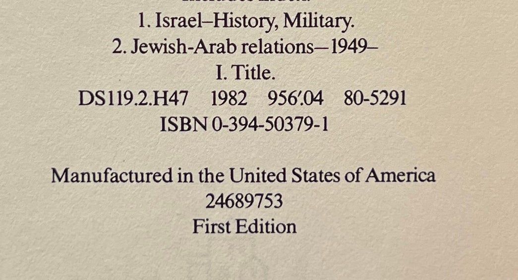 New York: Random House, 1982. First Edition. Hardcover. Very Good/Very Good. Very Good in a Very Good jacket, unclipped ($20.00), lightly bumped, a few shallow chips at the back panel. Quarter red cloth with brown paper on the boards, slightly bowed upward. Square and firmly bound, clean internally. Herzog's "blow-by-blow account" of the ongoing conflict between Arab armies and Israel.