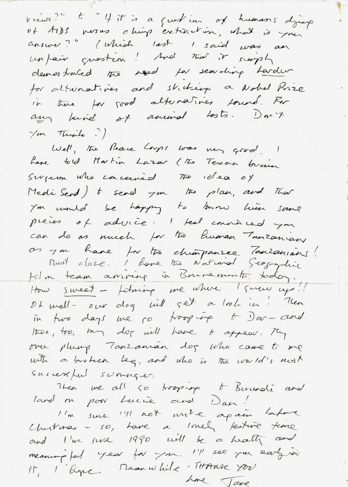 Bounemouth [sic], Dorset, 25 November 1989. Letter. Creasing from mailing. Near Fine. A two-page handwritten letter on both sides of an 8" x 11-3/4" sheet of paper. Excellent content regarding her ground-breaking work with chimpanzees. Addressed to Nancy [Reynolds]. Goodall begins, "I think you are one of the very most important things that has happened for the chimpanzees in years. I mean that. The people you can introduce me to can make so much difference. And I hope you know how very, very grateful I am. On behalf of all the chimps -- Thank you." Goodall mentions a U. S. NEWS lunch where she was asked "incredibly far ranging" questions, giving examples including "'If it is a question of humans dying of AIDS versus chimp extinction, what is your answer?'... And that it simply demonstrated the need for searching harder for alternatives and sticking a Nobel Prize in there for good alternatives found. For any kind of animal tests." She talks about her future plans and on how that very day the NATIONAL GEOGRAPHIC film team was arriving to film her where she grew up. SIGNED "Love/Jane."