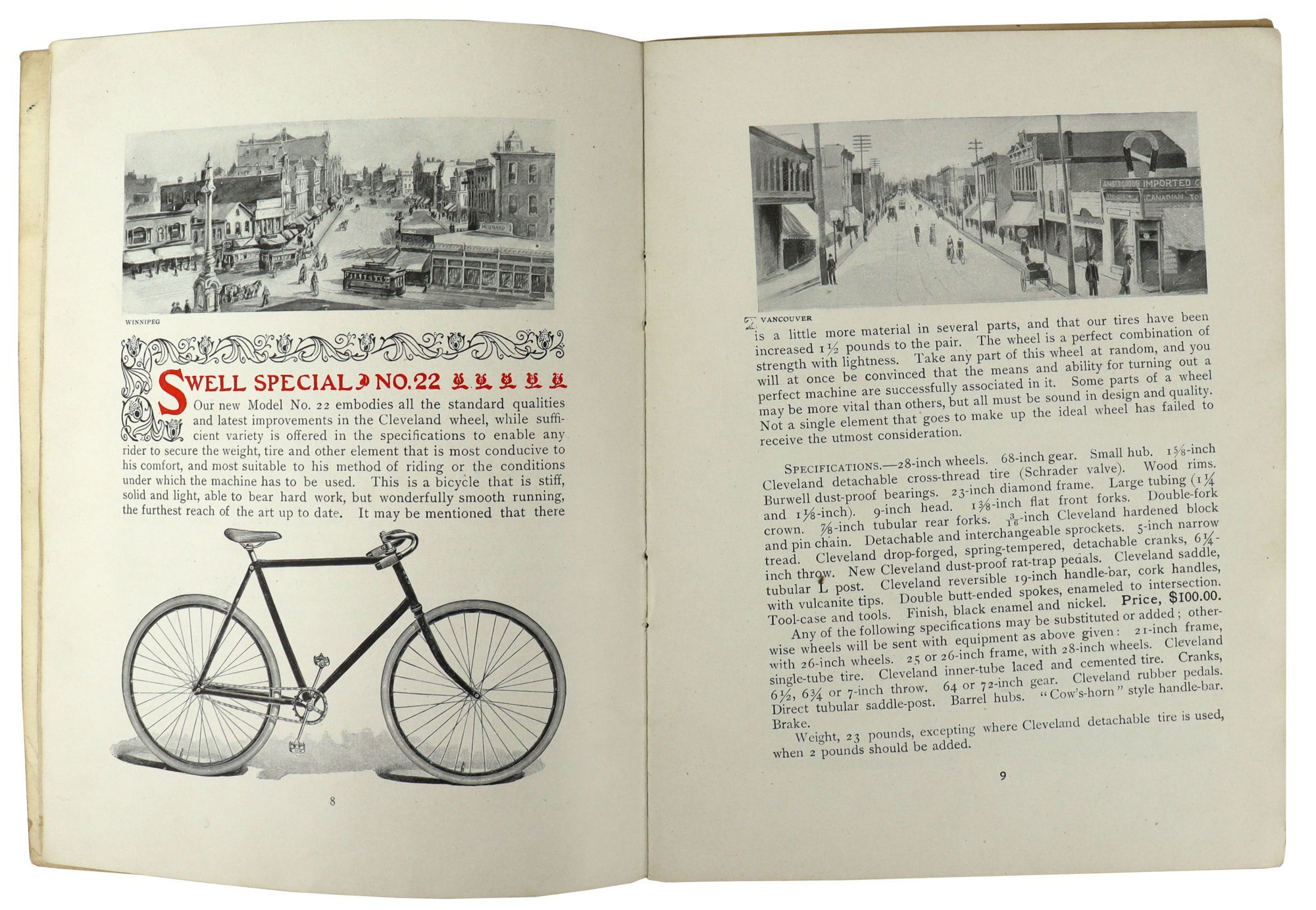 Cleveland Bicycles catalog for 1896, one year after Henry Abram Lozier expanded his bicycle business into Canada. (Shortly thereafter, Lozier would sell his bicycle business and enter the automobile industry.) The first of the company’s catalogs to appeal directly to Canadian customers, the catalog features illustrations of the country’s major cities alongside foreign metropolises like Tokyo, Calcutta, Cairo, and Rome. As the booklet’s introduction asserts that Cleveland Bicycles offer “a wheel for all riders, all countries and all seasons.”