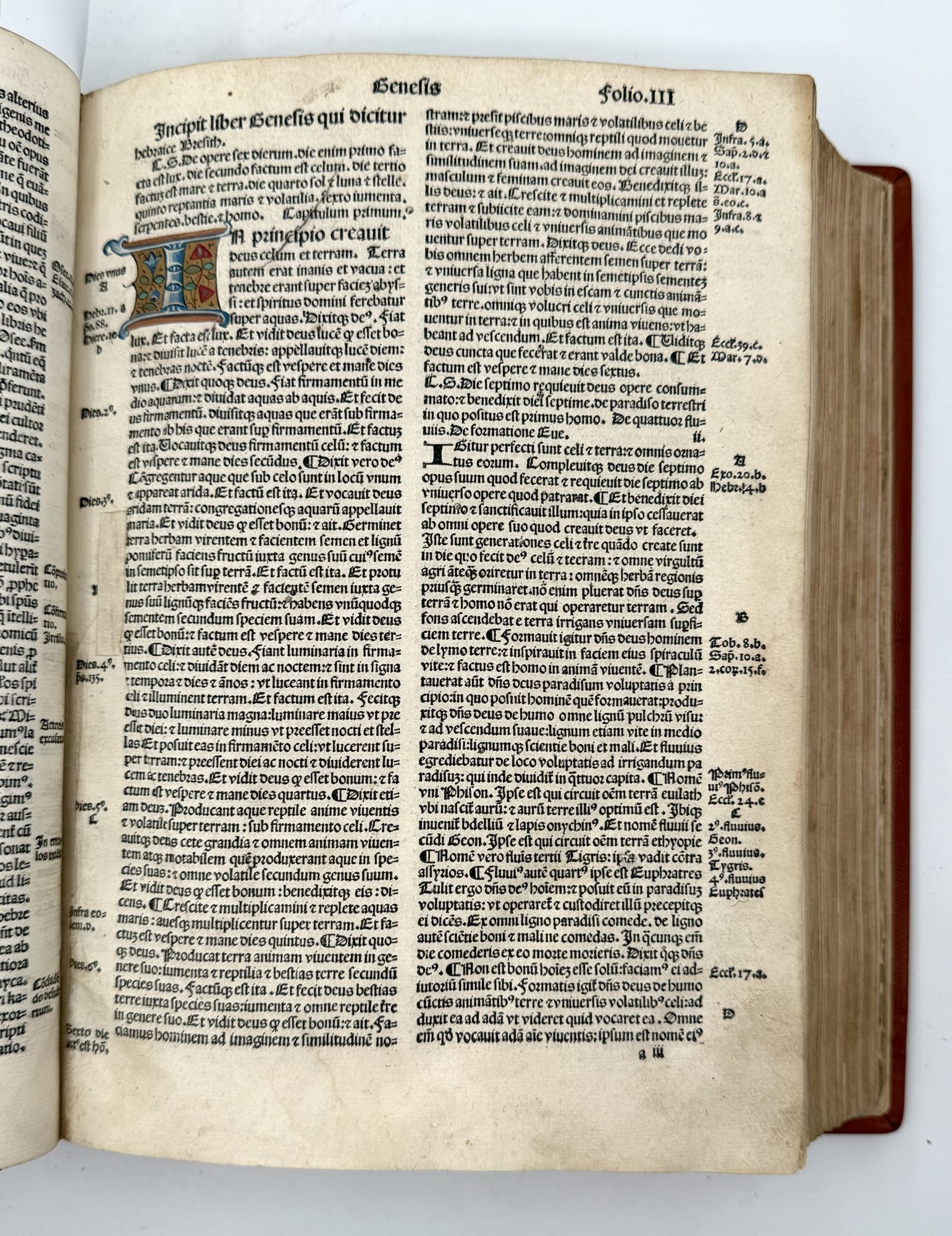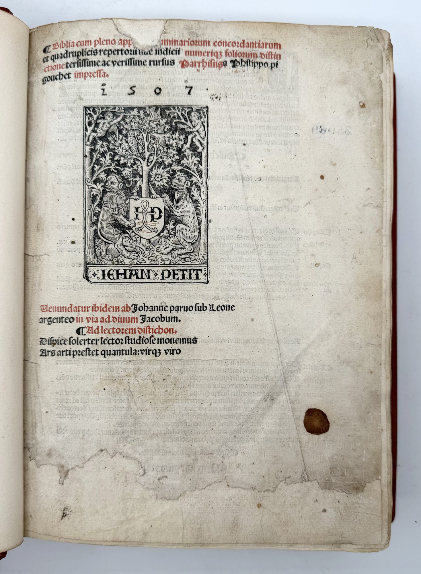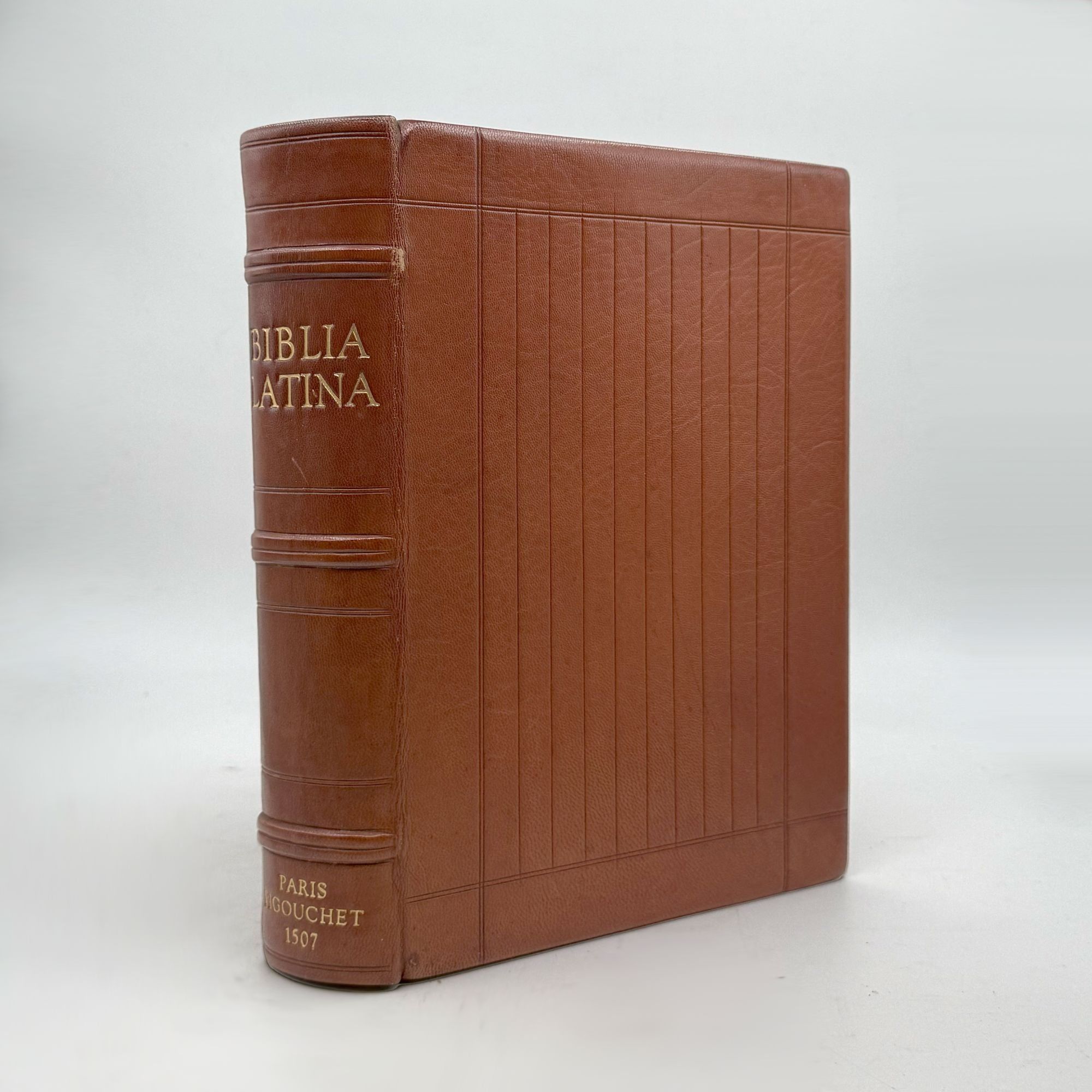 Paris: Philippe Pigouchet, 1507. Title page printed in red and black, with device of Jehan Petit, repeated at end on 348v. With gilt illuminated initials at Epistle of Jerome and Genesis, and a few other illuminations. Printed ornamental initials, one woodcut. Text in two columns, 55 lines. [14], 347, [348], [20] ff. Terminal blank CC8 present. 1 vols. Small folio. Twentieth century brown morocco block in blind, spine titled in gilt, by Gerhard Gerlach. First leaf with ink date 1507 added, paper repairs at head and bottom margin, a few other paper repairs; last text leaf a bit trimmed at headline; a few minor wormholes. Very good plus in a nice binding. Title page printed in red and black, with device of Jehan Petit, repeated at end on 348v. With gilt illuminated initials at Epistle of Jerome and Genesis, and a few other illuminations. Printed ornamental initials, one woodcut. Text in two columns, 55 lines. [14], 347, [348], [20] ff. Terminal blank CC8 present. 1 vols. Small folio. Attractive copy of this early sixteenth century Latin Bible, printed by Philippe Pigouchet for Jean Petit at the sign of the Silver Lion.