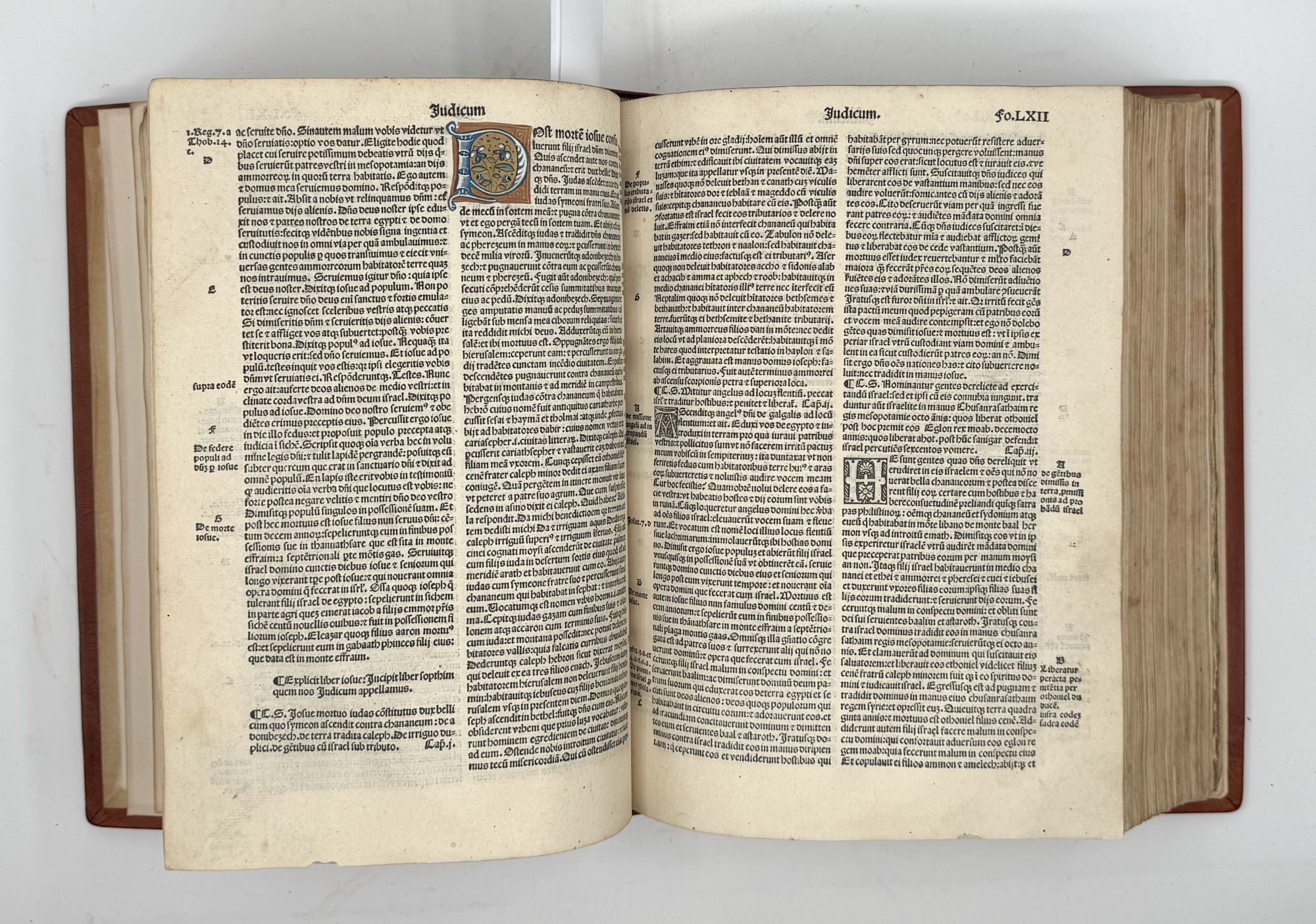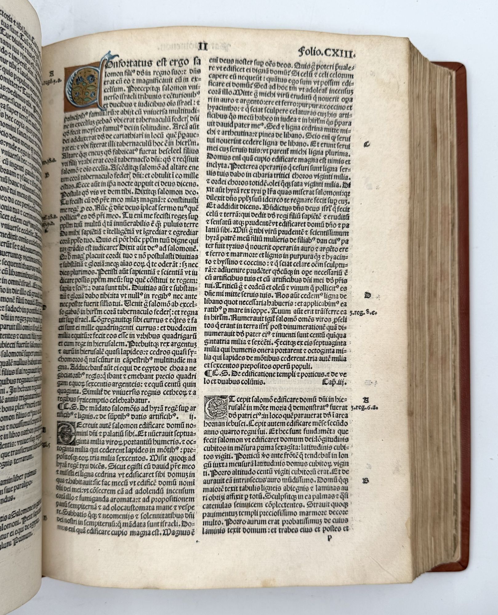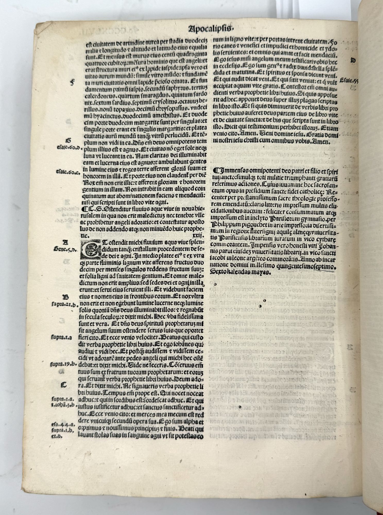 Paris: Philippe Pigouchet, 1507. Title page printed in red and black, with device of Jehan Petit, repeated at end on 348v. With gilt illuminated initials at Epistle of Jerome and Genesis, and a few other illuminations. Printed ornamental initials, one woodcut. Text in two columns, 55 lines. [14], 347, [348], [20] ff. Terminal blank CC8 present. 1 vols. Small folio. Twentieth century brown morocco block in blind, spine titled in gilt, by Gerhard Gerlach. First leaf with ink date 1507 added, paper repairs at head and bottom margin, a few other paper repairs; last text leaf a bit trimmed at headline; a few minor wormholes. Very good plus in a nice binding. Title page printed in red and black, with device of Jehan Petit, repeated at end on 348v. With gilt illuminated initials at Epistle of Jerome and Genesis, and a few other illuminations. Printed ornamental initials, one woodcut. Text in two columns, 55 lines. [14], 347, [348], [20] ff. Terminal blank CC8 present. 1 vols. Small folio. Attractive copy of this early sixteenth century Latin Bible, printed by Philippe Pigouchet for Jean Petit at the sign of the Silver Lion.