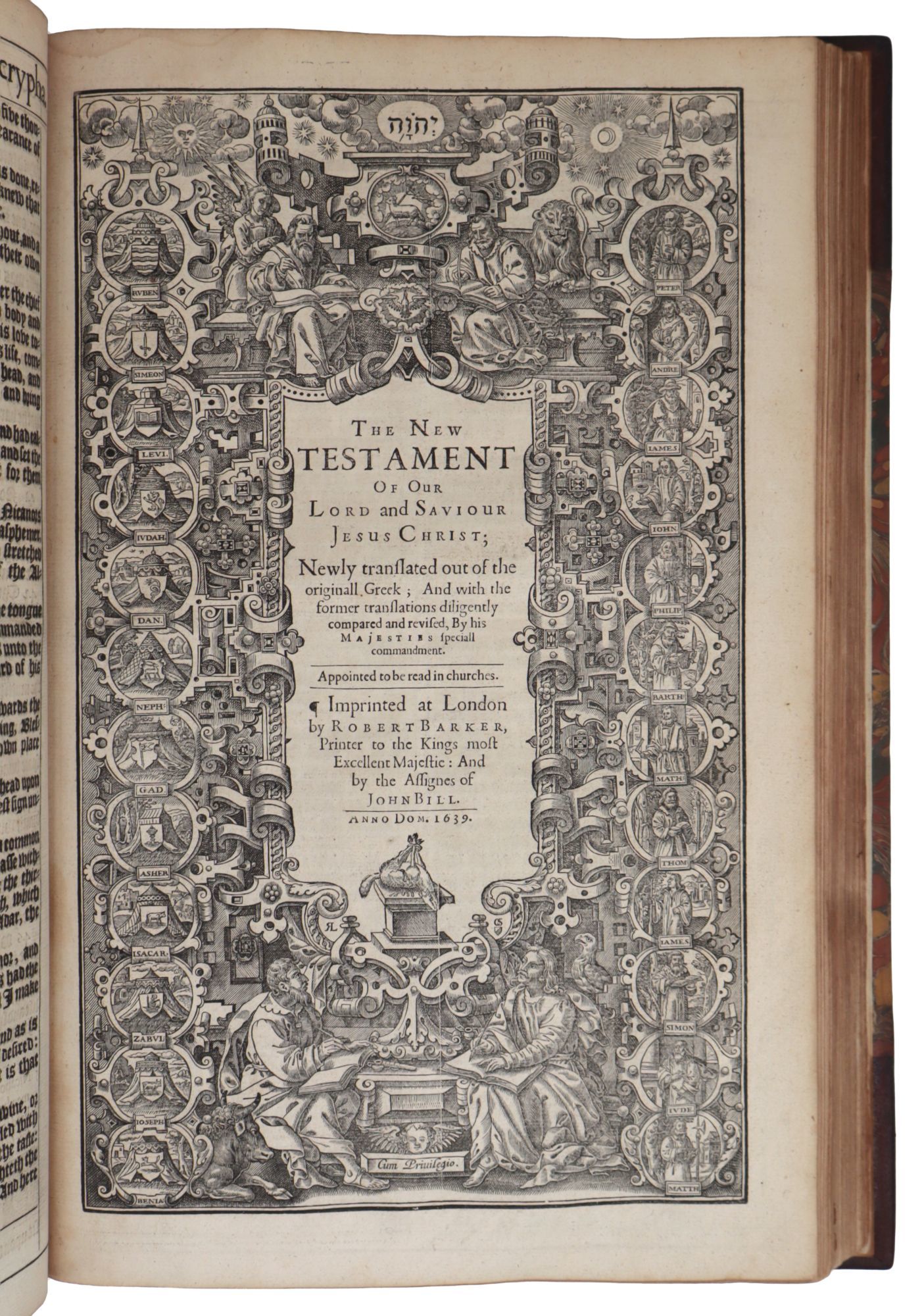 - New Testament with ornamental title page, dated 1639. Text in Black letter in two columns. Calendar, Almanac, list of holy days,