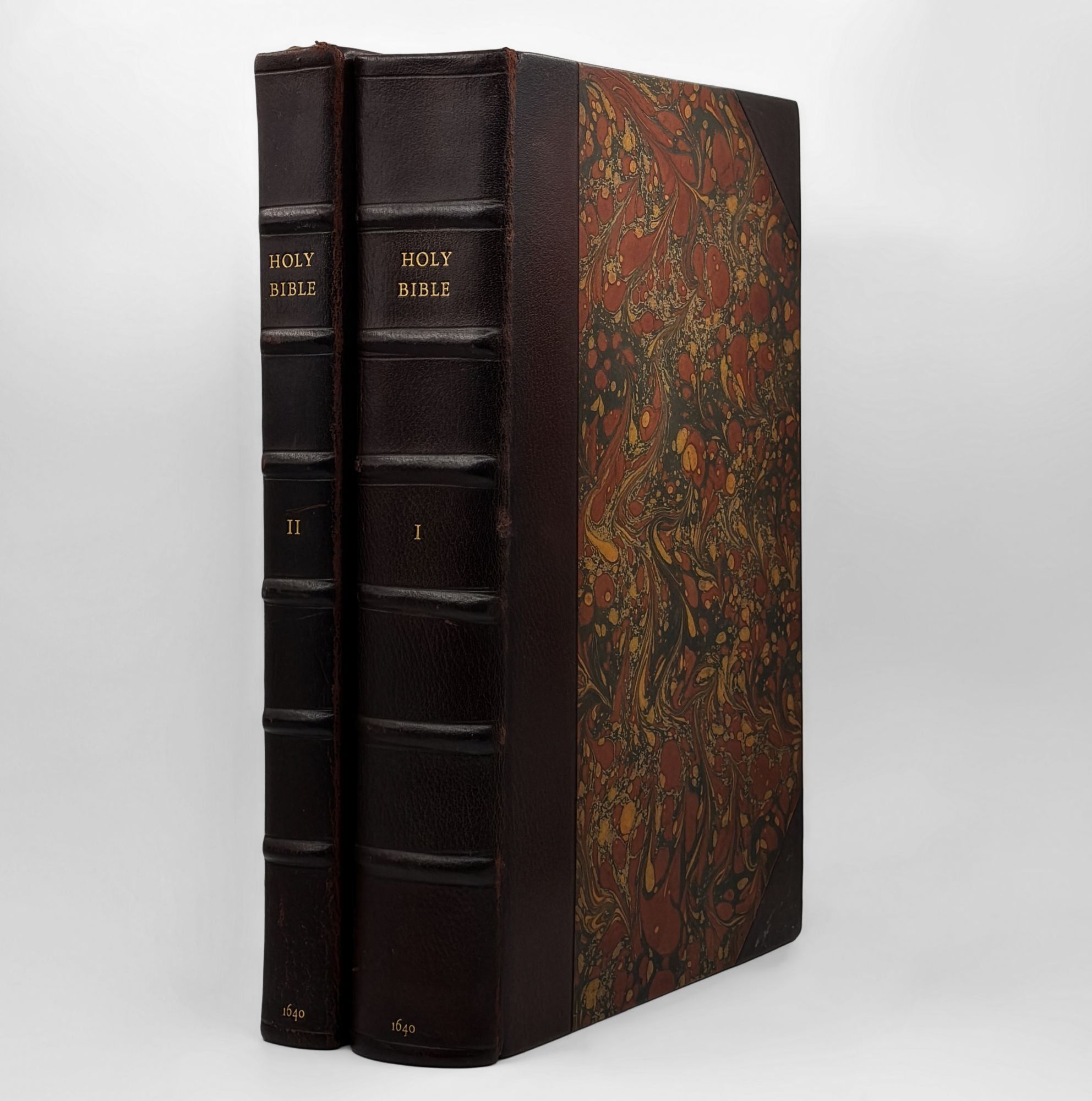 London: Barker, 1640. New Testament with ornamental title page, dated 1639. Text in Black letter in two columns. Calendar, Almanac, list of holy days, and table of contents (sigs. C & D) are printed in red and black. Collation: A-B⁴ C⁶ D⁴ ²A-6D⁶. General title page in facsimile. Apocrypha and N.T. bound as vol. 2. 2 vols. Folio. Twentieth century half brown morocco and marbled boards. Minor rubbing. General title page in facsimile; dedication leaf remargined at gutter. Very good plus. New Testament with ornamental title page, dated 1639. Text in Black letter in two columns. Calendar, Almanac, list of holy days, and table of contents (sigs. C & D) are printed in red and black. Collation: A-B⁴ C⁶ D⁴ ²A-6D⁶. General title page in facsimile. Apocrypha and N.T. bound as vol. 2. 2 vols. Folio. Sound, attractive copy of the folio Authorzed edition of the English Bible, printed in large black leeter type, published in successive editions, the first in 1611, followed by 1613/11, 1617, 1634, and this edition: all five “closely resemble each other … These agree so closely that the corresponding leaves practically always end with the same word” (Darlow & Moule, note).