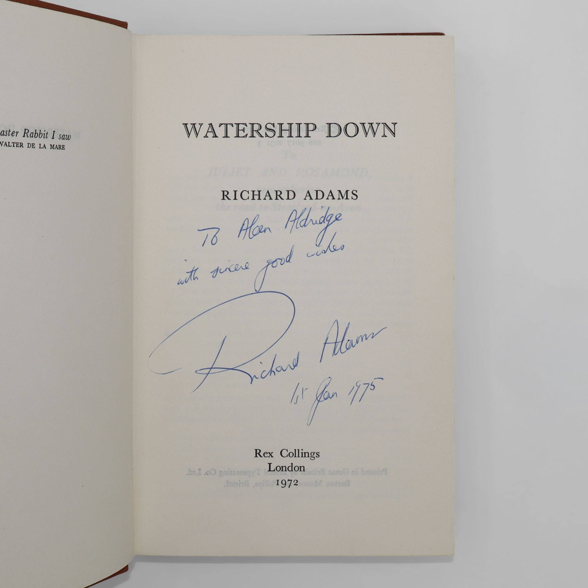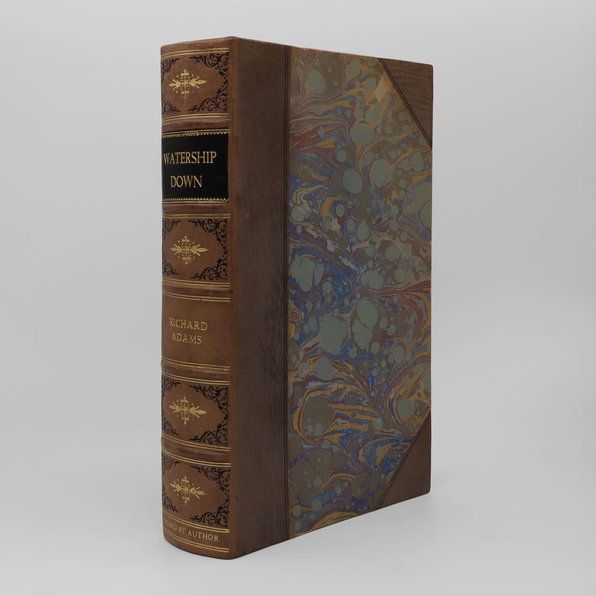 London: Rex Collings, 1972. First edition. Folding map. 1 vols. 8vo. Original brown cloth, stamped in gilt on cover and spine; illustrated dust jacket; minor bumps to bottom corners, with small repair, else a fine copy. Grey half morocco folding case with marbled paper sides, raised bands, and extra-gilt spine. First edition. Folding map. 1 vols. 8vo. A fine copy of this beloved modern classic, inscribed on the title-page: “To Alan Aldridge / with sincere good wishes / Richard Adams / 1st Jan 1975.” Aldridge was an artist who, while best known for his psychedelic album covers for The Beatles, The Who, Elton John, and the Rolling Stones, also illustrated children's books. His 1973 work, The Butterfly Ball and the Grasshopper Feast, won that year's Whitbread Children's Book Award, an honor which likely brought him to Adams' attention, who then enlisted him as the illustrator for his 1977 book, The Ship’s Cat — quite possibly at the time of this inscription.
