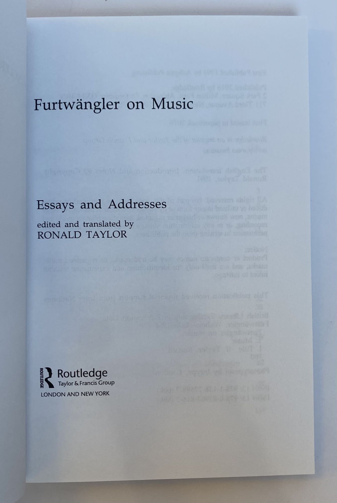 Middletown, DE: Routledge, 2019. Softcover. Octavo, 182 pages. In Very Good condition. Red spine with gold lettering. Minor shelf wear. Shelved under Front Counter. Wilhelm Furtwängler (1886-1954) was an esteemed German conductor and composer. In a series of essays, he addresses several influential composers including Bach, Beethoven, and Mendelssohn. 1407409. Shelved Dupont Bookstore.