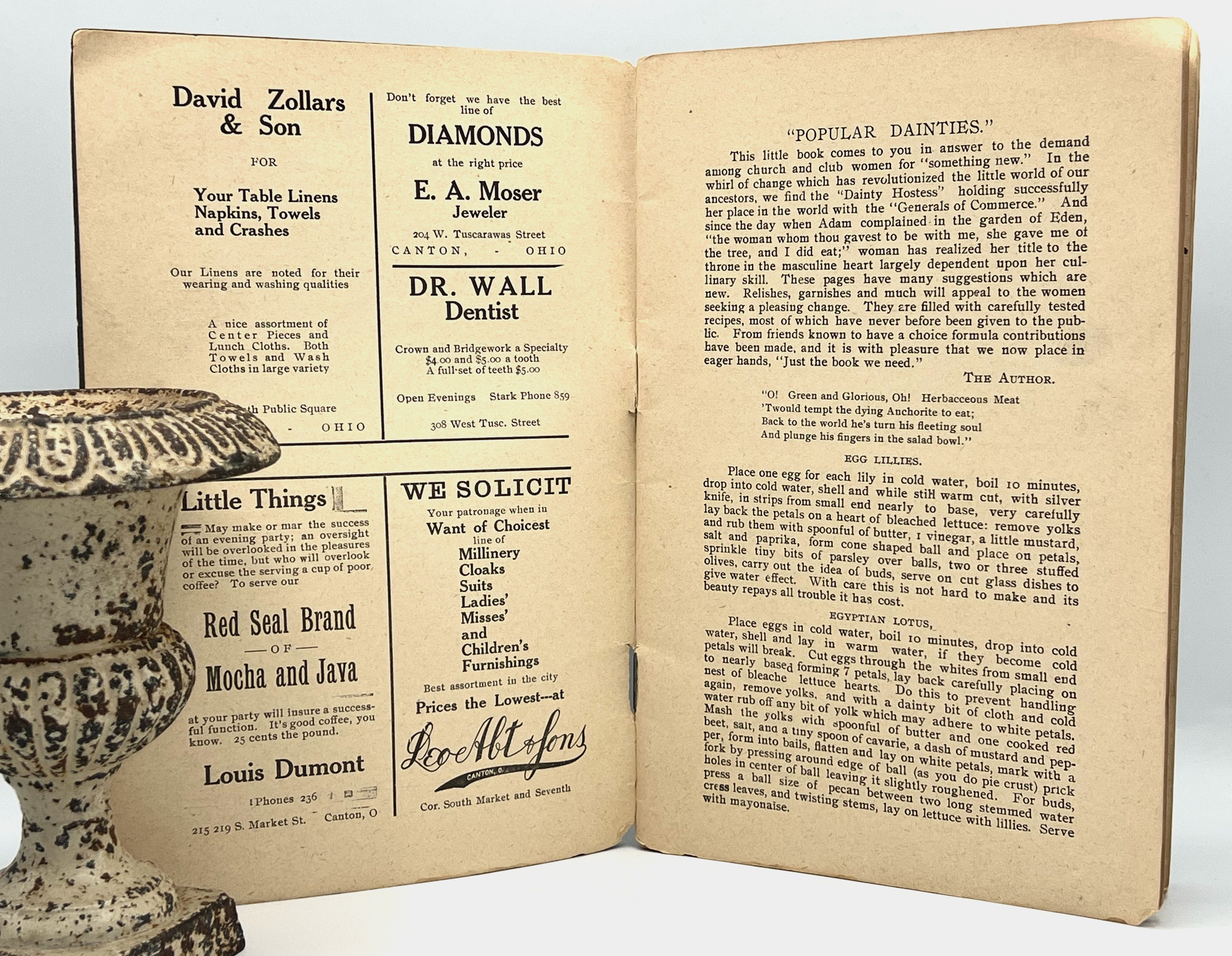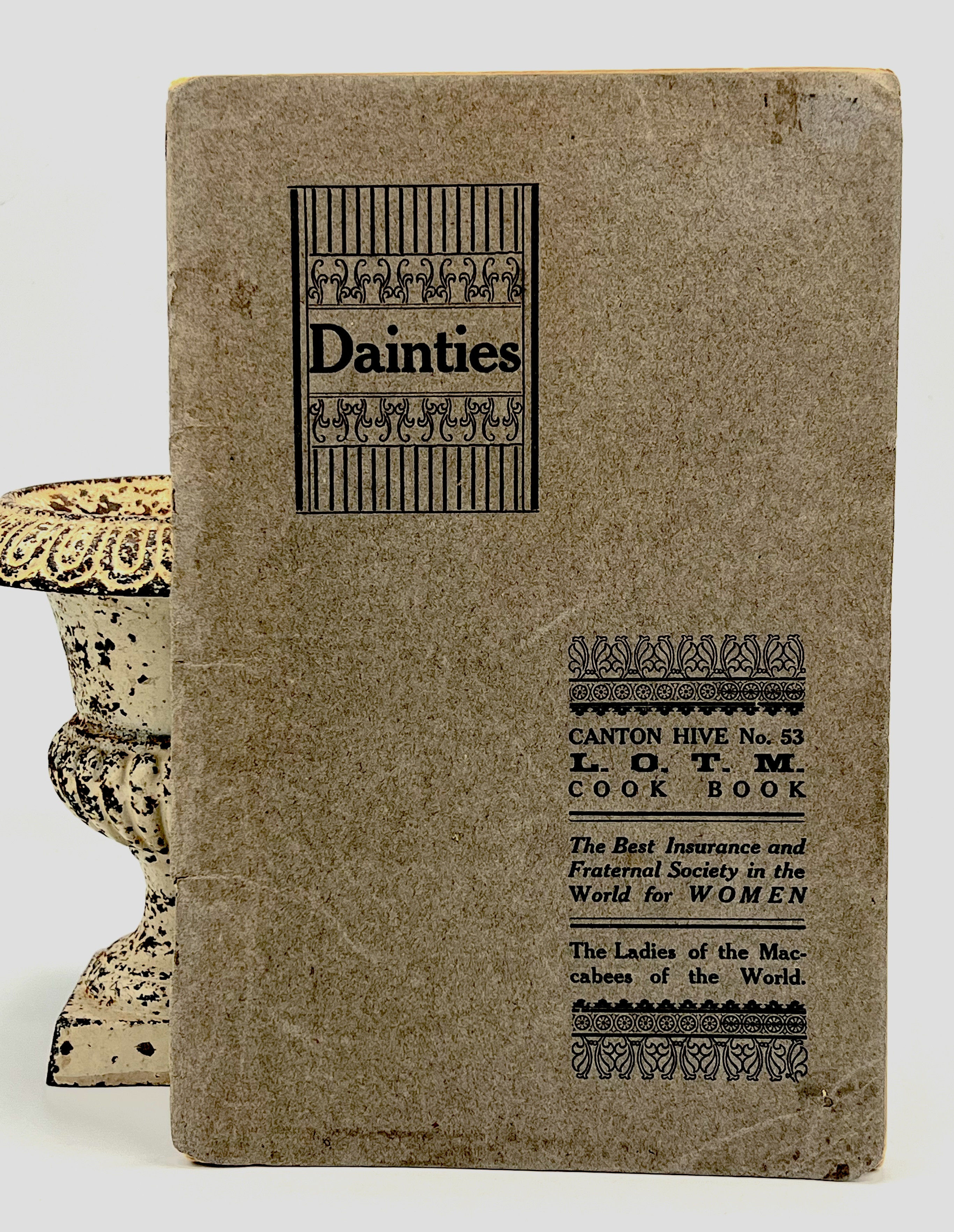 Canton, Ohio: The Ladies of the Maccabees of the World - CANTON HIVE No. 53, c. 1907. Staplebound. Gray wraps. Good. 48 pages. 21.5 x 14.5 cm. A delightful period cookbook filled with recipes and local advertisements. Of particular interest is the final chapter - A FEW SUGGESTIONS FOR CHURCH SUPPERS. Here we find recipes for making Tamales in huge quantities, Fish Chowder for 200, Chop Suey, Egg Foo Tong, and Mushrooms a La Japan for a Crowd. The Ladies of the Maccabees (L.O.T.M.) was the first fraternal benefit society operated exclusively by women. Operating as an insurance benefit society - members were assessed (10 cents) to go into a pot to provide widows with death benefits and eventually sick benefits. The organization was originally formed in Michigan but grew to other "hives" - this hive being the Canton (Ohio) Hive No. 53. Interior clean. Wraps lightly soiled and holding.