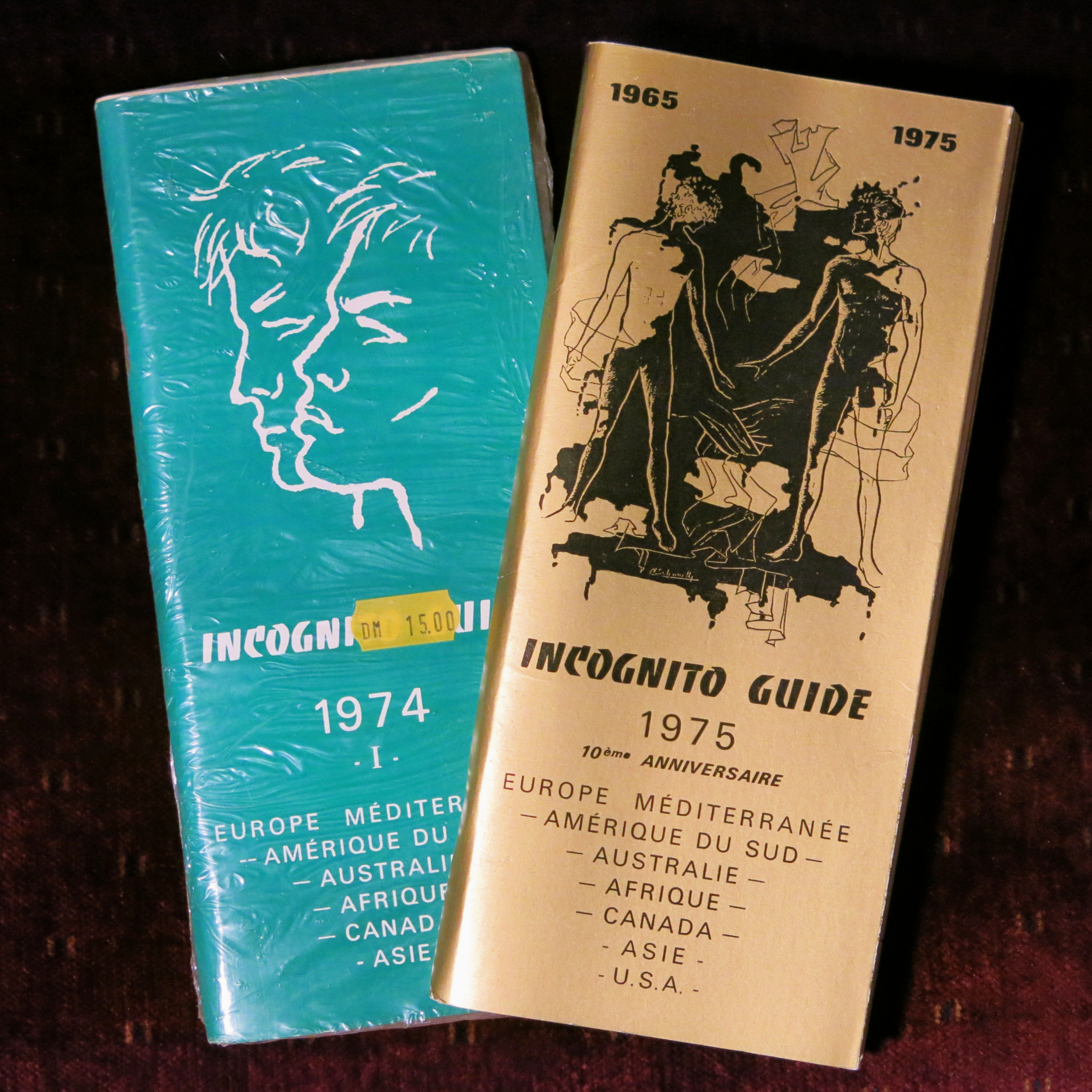 Incognito Guide Europe, Méditerranée, Amérique du Sud, Australie, Afrique, Canada, Asie, U.S.A. 1975. 10eme anniversaire (Paris: A.S.L.); 200 pages.