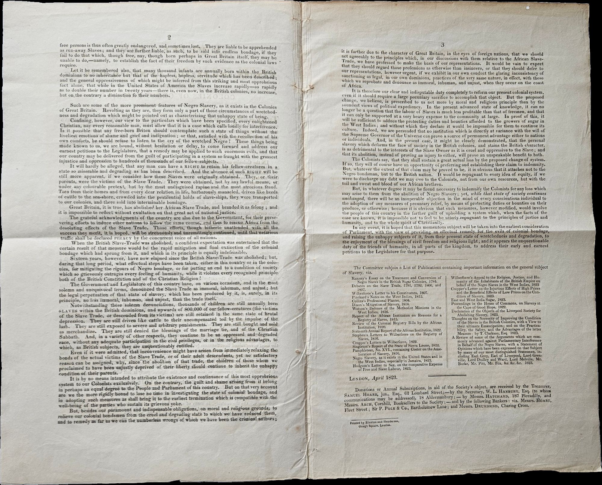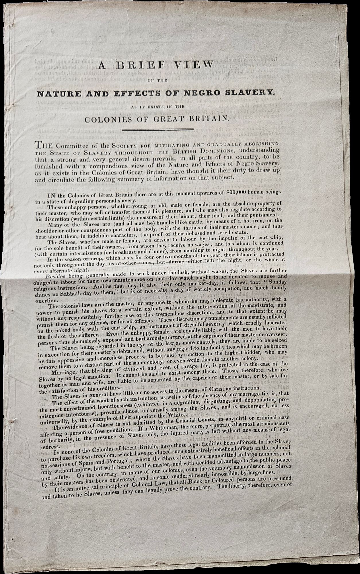 London, England: Ellerton and Henderson, 1823. Three page document measuring 8 ½ x 13 ¼ inches. Folded with some small wrinkles at edges, else Near Fine.. A document produced by the Society for Mitigating and Gradually Abolishing the State of Slavery throughout the British Dominions, better known as the Anti-Slavery Society. The group was founded in London in 1823 by a group of politicians, philanthropists, and businessmen including William Wilberforce, Joseph Sturge, and Zachary Macaulay. The document discusses the horrors of enslavement—even unfavorably comparing the British colonies’ conditions with those in the US—and decries the fact that, after the 1807 Slave Trade Act, essentially nothing more had been done to put “an end to a condition of society which so grievously outrages every feeling of humanity”. We find a single copy of the Ellerton and Henderson edition in physical format listed in OCLC as accession number 83930673.