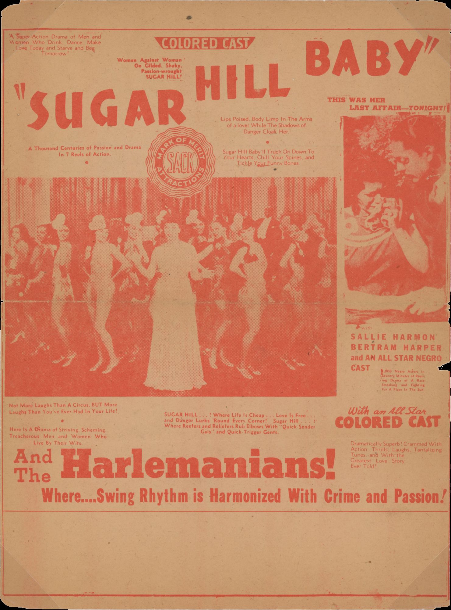 The flyer’s copy promises that the film is “Dramatically Superb! Crammed With Action, Thrills, Laughs, Tantalizing Tunes, and With the Greatest Love Story Ever Told!” Sugar Hill Baby is one of the many so-called “race films”—films by and for Black audiences—that have been lost to time.