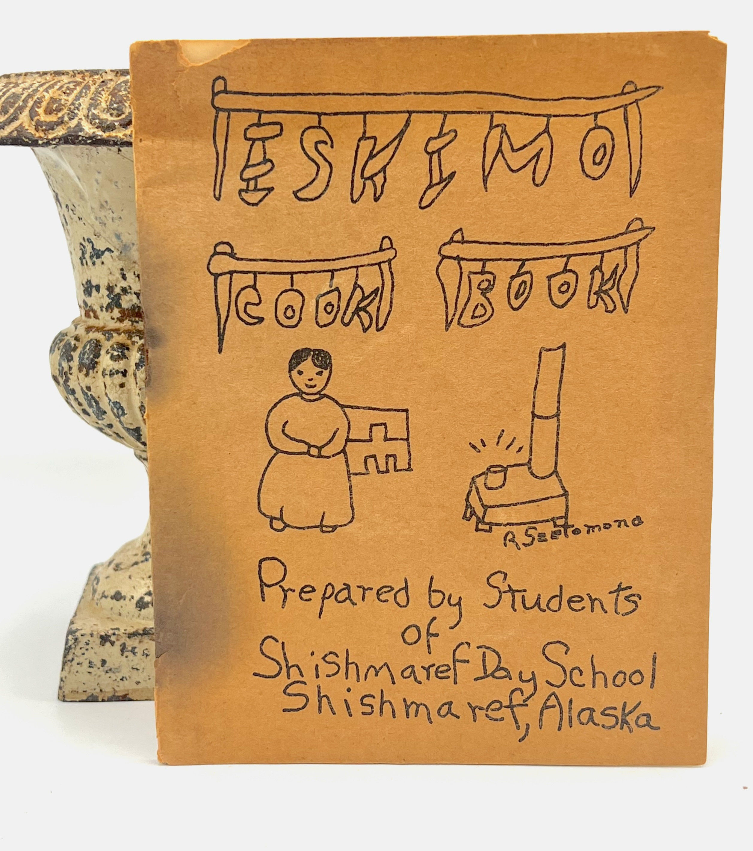 Anchorage, Alaska: Alaska Crippled Children's Association, Inc., 1952. Staplebound. Brown illustrated wraps. Very good. 36 pages. 10.5 x 13 cm. Native Alaskan recipes attributed to students. Project initiated by teachers for fundraising. Recipes include translations of native expressions. Includes index and ordering form. Illustrated throughout. Light toning to first page. Covers toned at spine from staples