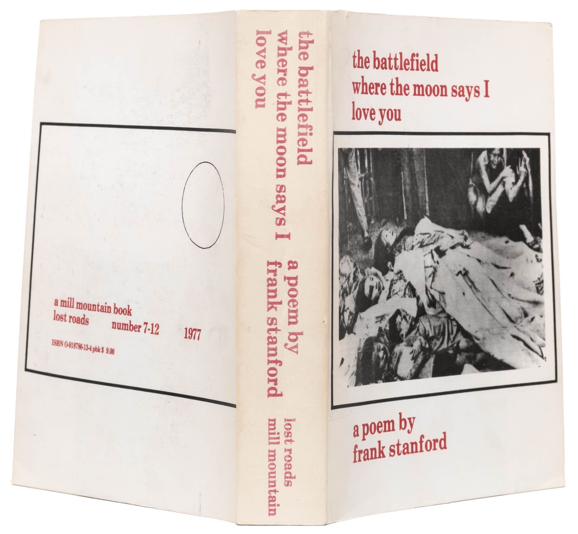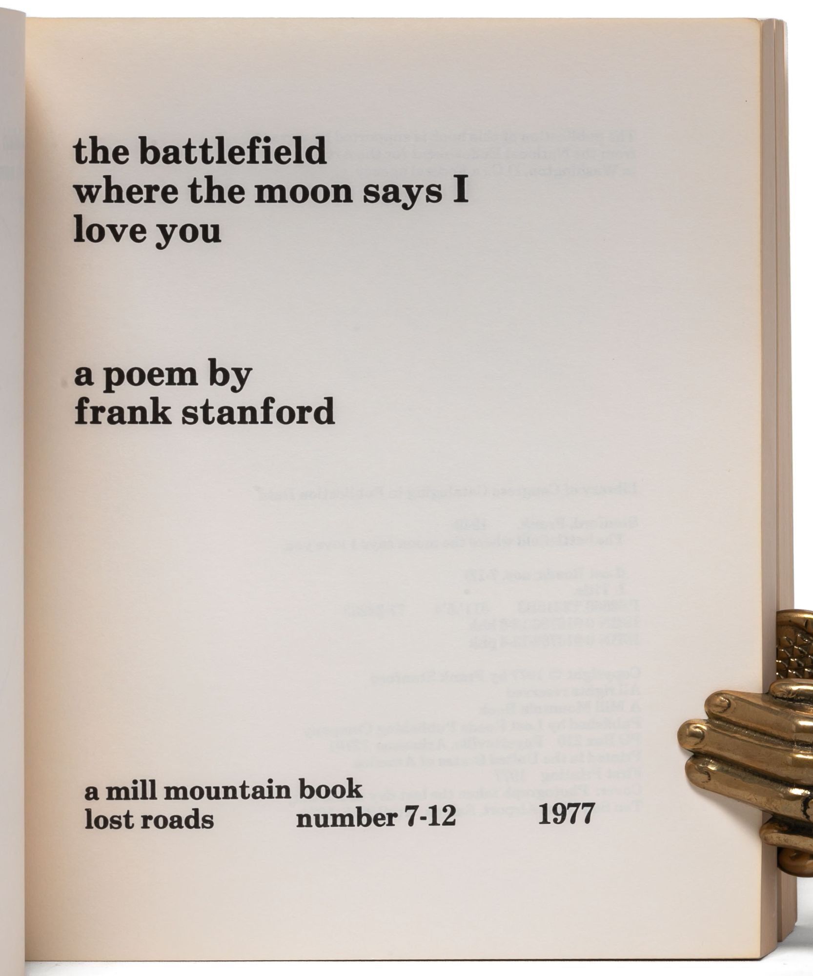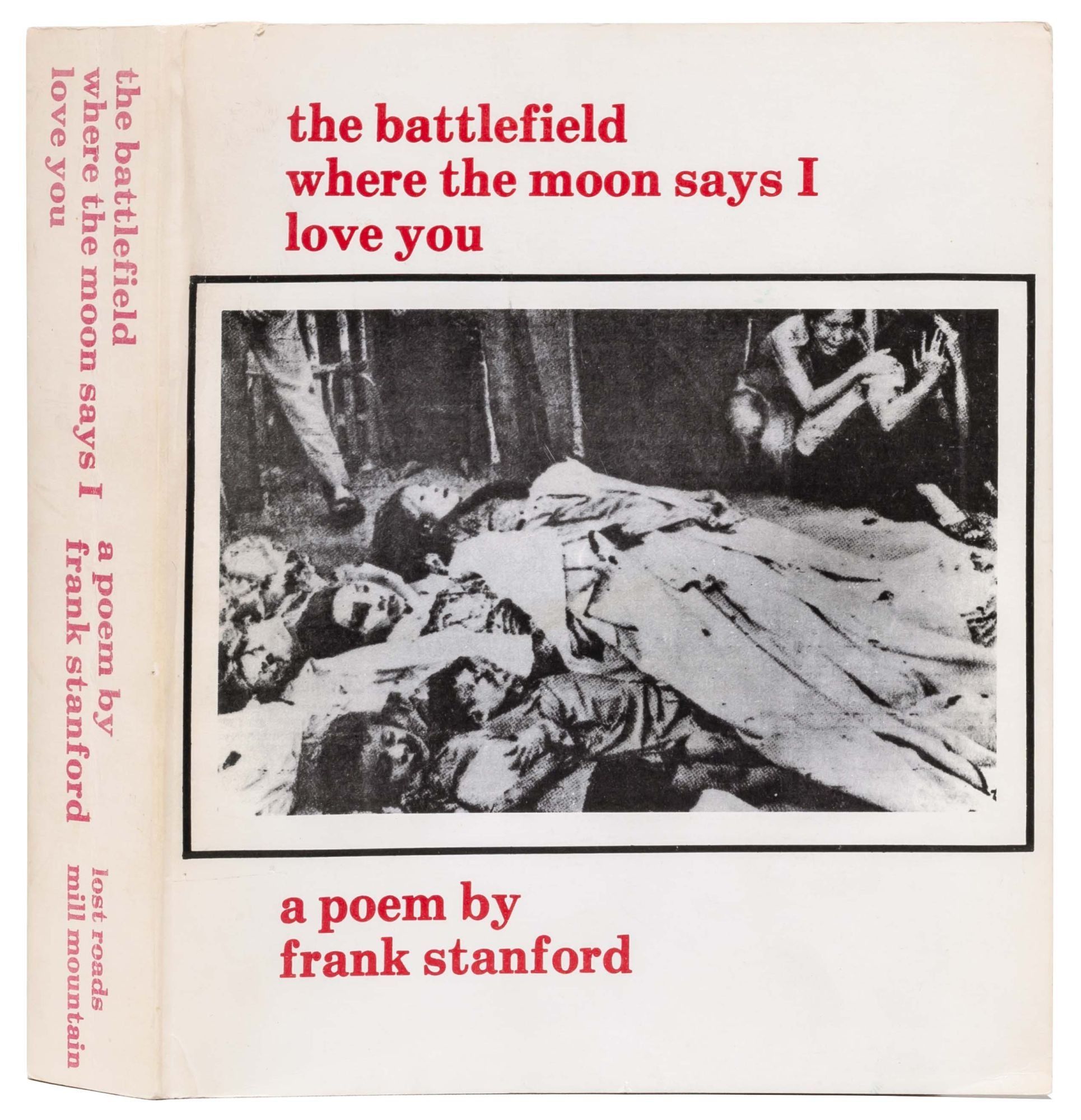 A Southern poet who was prolific during his all-too-brief career, Frank Stanford (1948 - 1978) published his magnum opus, The Battlefield Where the Moon Says I Love You, the year before his suicide. This 542-page stream-of-consciousness poem, written in one sentence, has reached cult status among poets, and has earned Stanford comparisons to Whitman and Rimbaud. To this day, the epic poem is considered a creative marvel, and has reached even greater acclaim since its publication in a new edition in 2000. Of Battlefield, the poet John Berryman proclaimed, "Most poets would give their left eye to have written this." Near Fine.