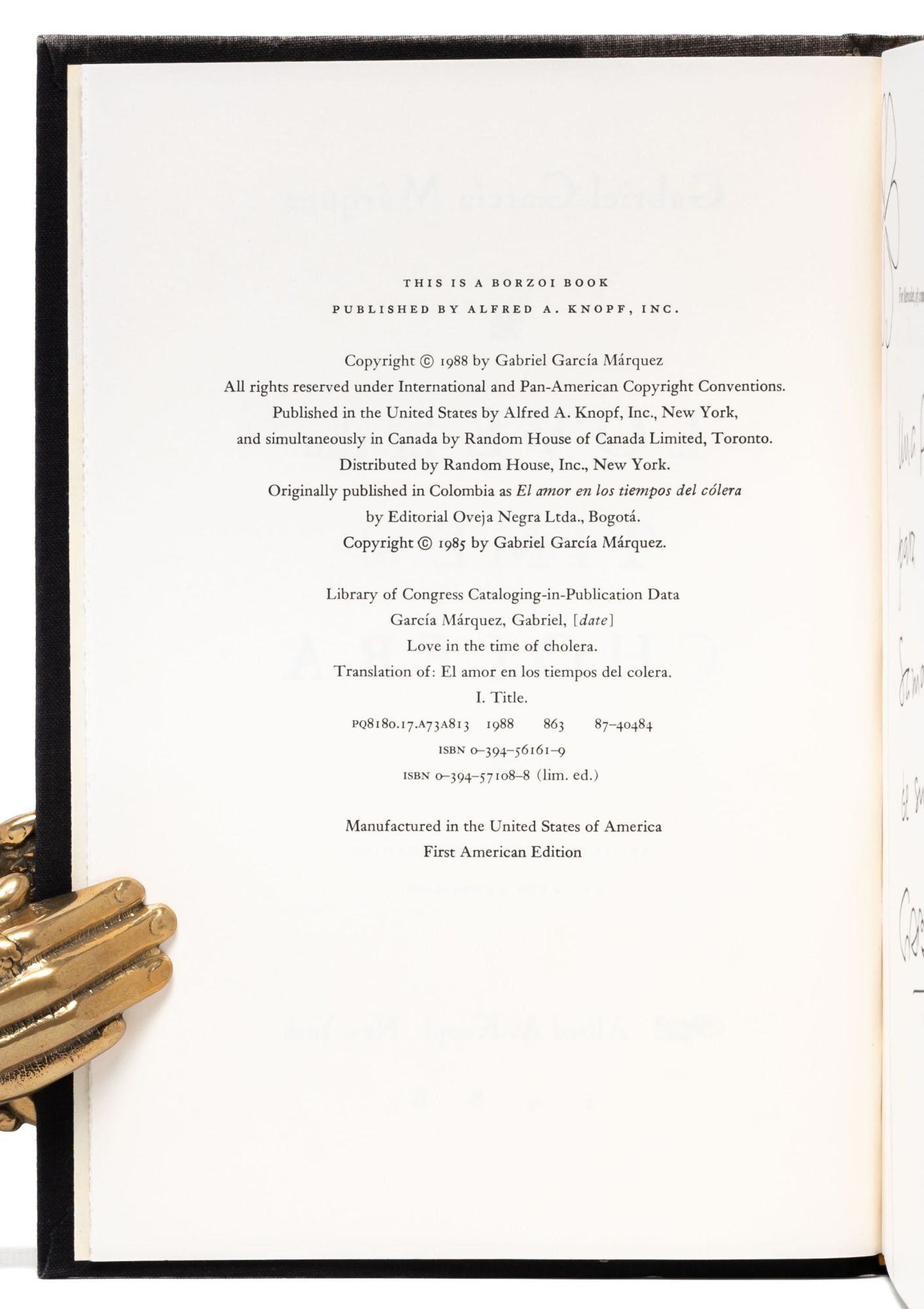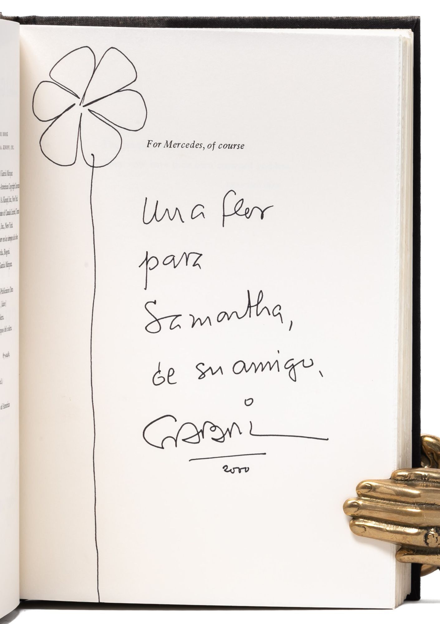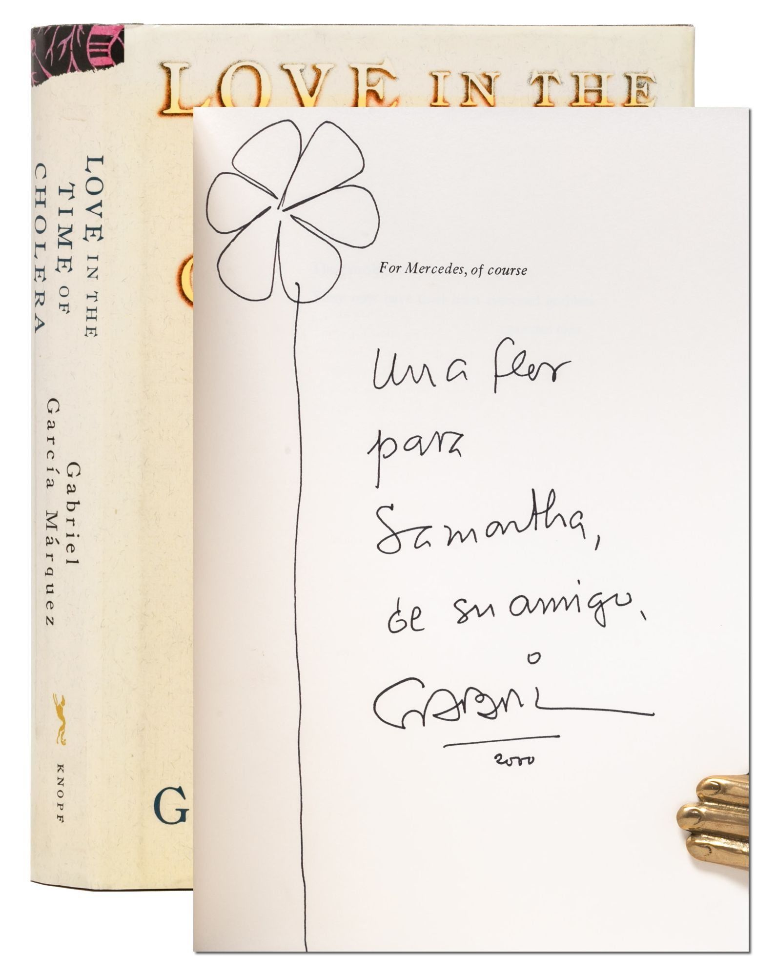 New York: Alfred A. Knopf, 1988. First edition in English. Near Fine/Very Good+. Warmly inscribed on the dedication page by Gabriel García Márquez to actress Samantha Eggar, with a doodle of a flower: "Una flor para Samantha, de su amigo, Gabriel - 2000" ("A flower for Samantha, from your friend"). A Near Fine copy in Very Good+ dust jacket. Publisher's black cloth boards, sunned at top edge. With the bookplate of Samantha Eggar to upper pastedown. Some toning to upper endpapers, otherwise a very clean copy. Unclipped dust jacket faded at edges, spine, and back panel. A fresh example overall, with an exceptional inscription.