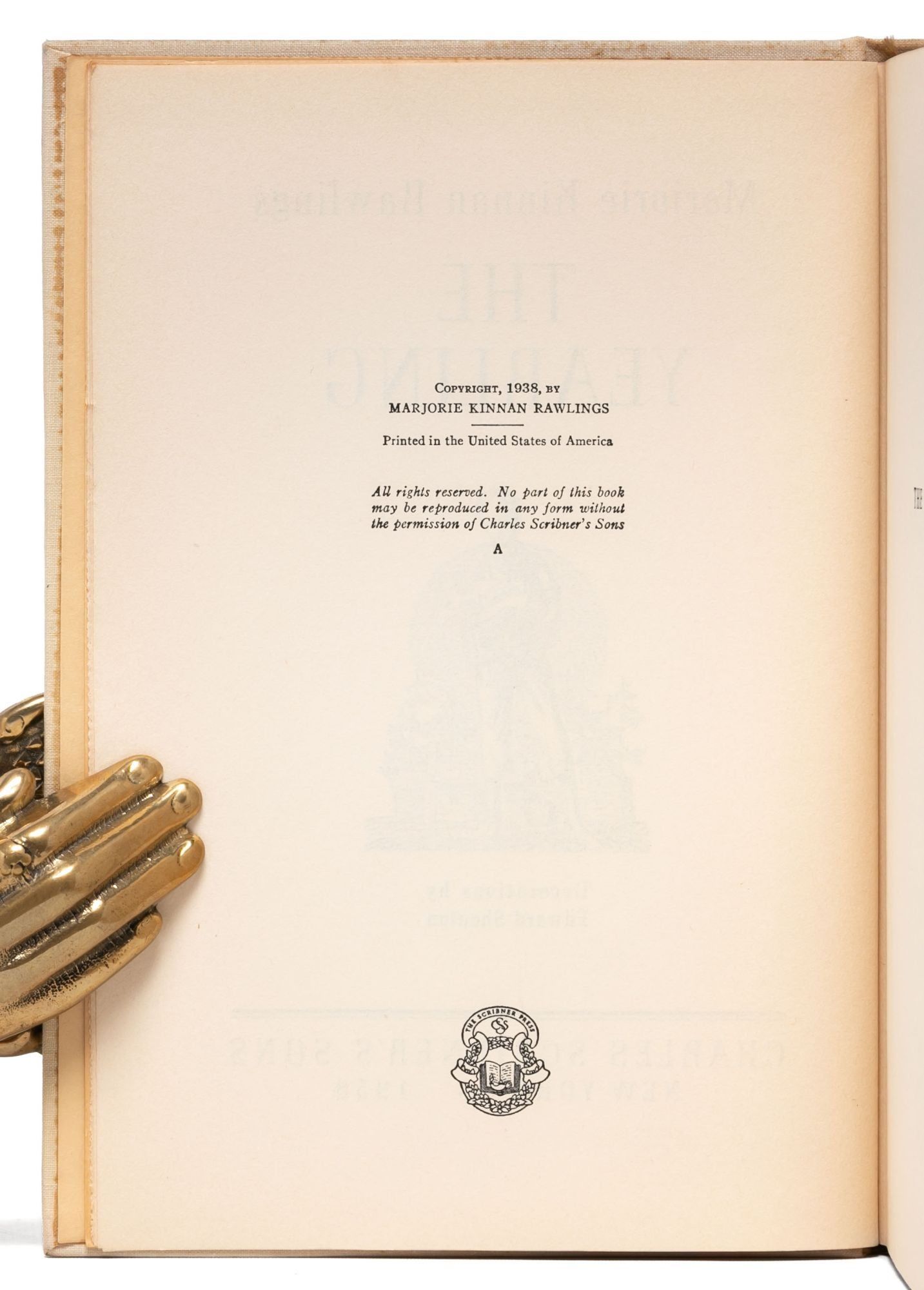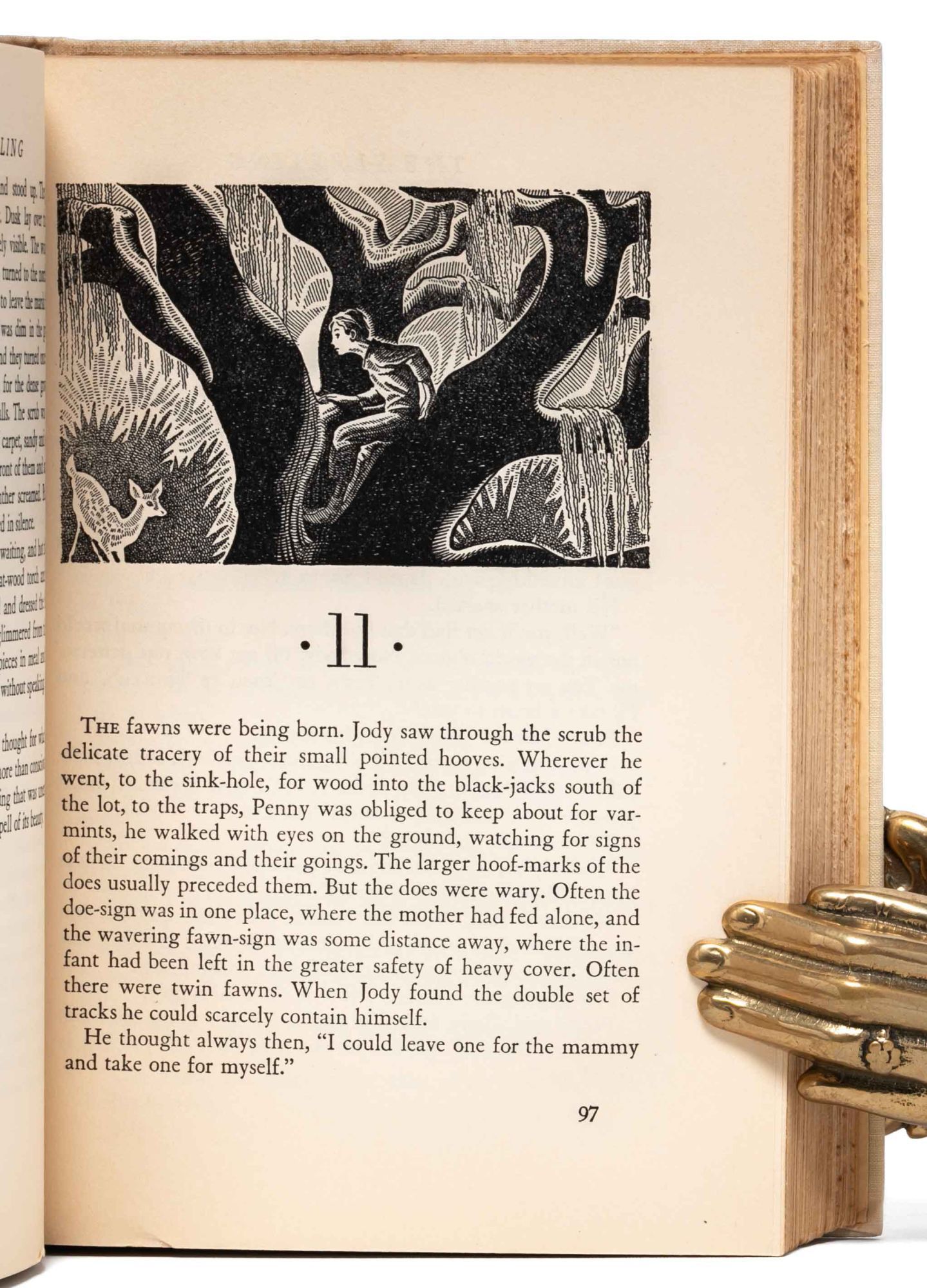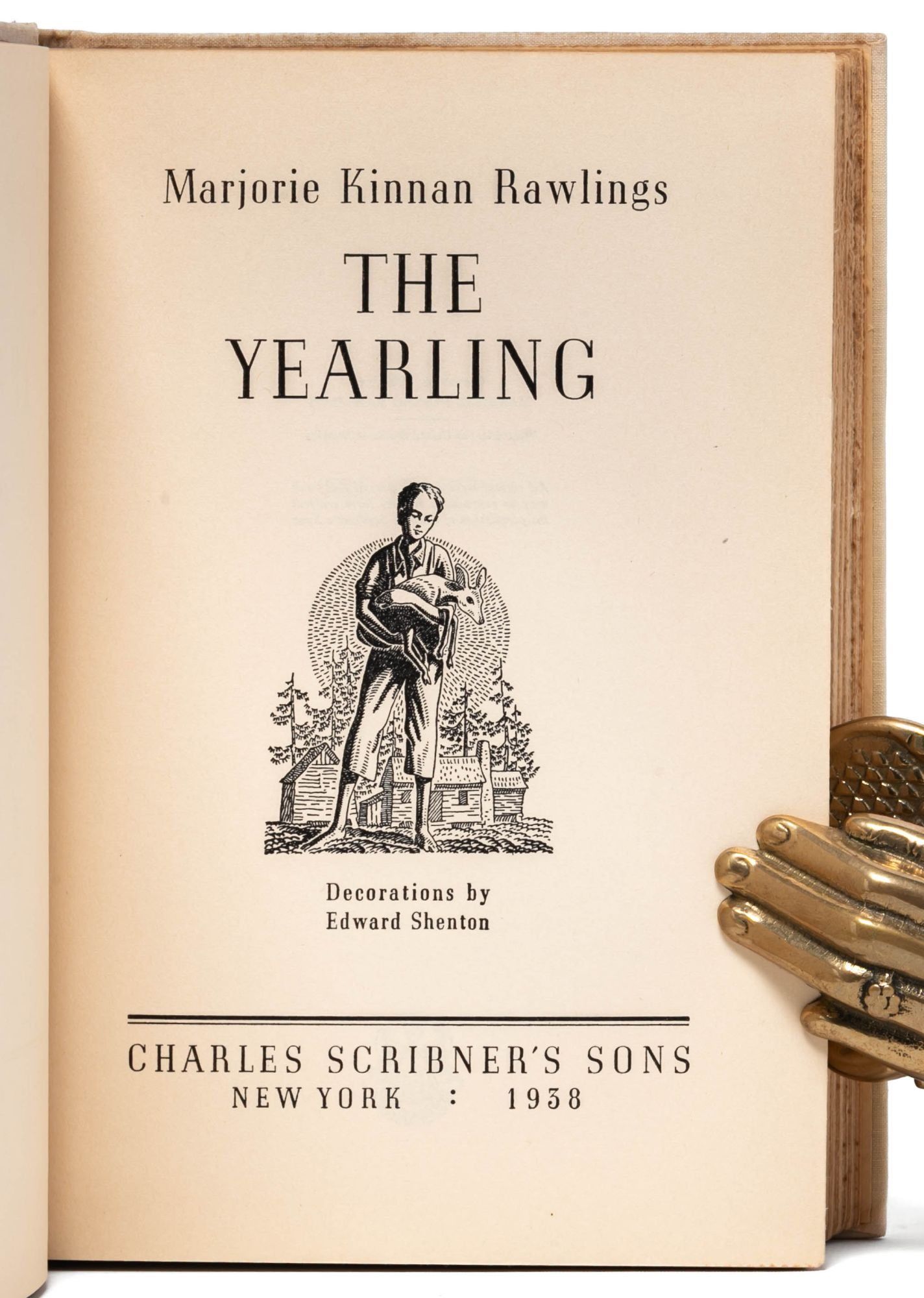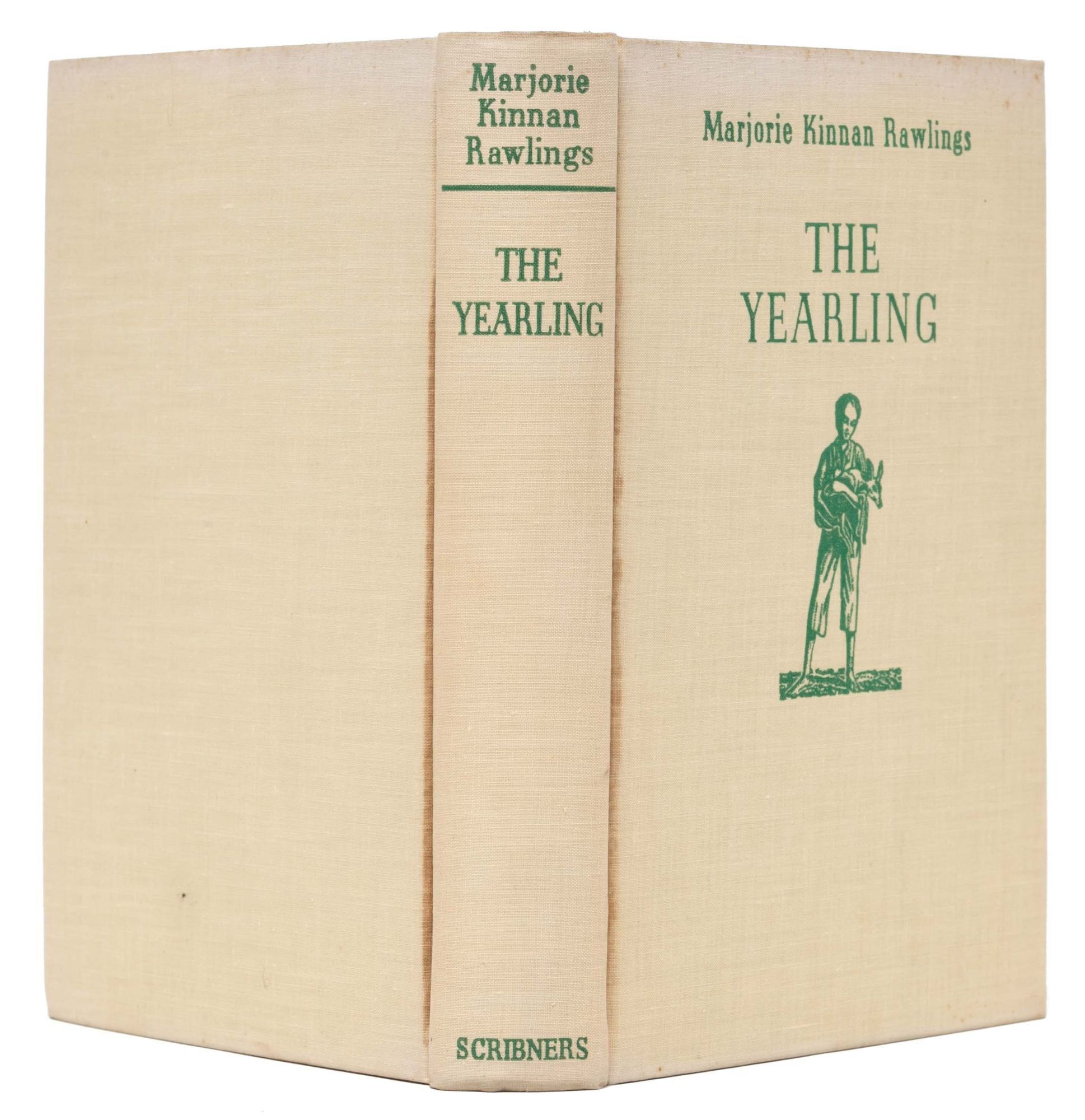 Marjorie Kinnan Rawlings' beloved 1938 novel, set in rural Florida, The Yearling follows the story of Jody Baxter, a child who becomes friends with a fawn after his father kills the fawn’s mother. The book was the best-selling novel the year it was released and would win the Pulitzer Prize for Fiction in 1939. Translated into over twenty languages, The Yearling was also adapted into a 1946 film starring Gregory Peck and Jane Wyman, who would both receive Academy Award nominations for their performances. “The thing about The Yearling, its great claim to distinction, is that it is able to make so much of simple, homely events” (contemporary New York Times review). The woodcut illustrations were completed by artist, author, and educator Edward Shenton (1895 - 1977). Near Fine in Near Fine dust jacket.
