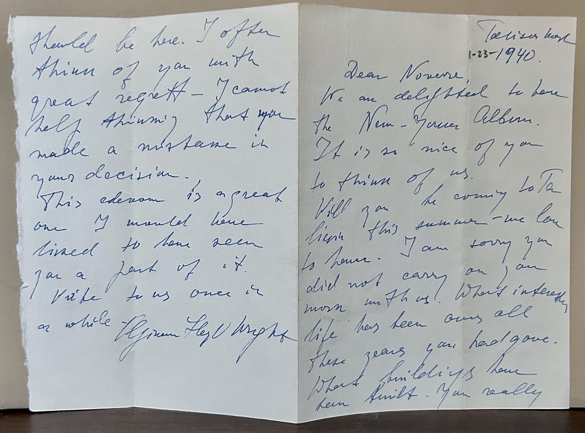 Taliesen, 1940. First edition. Wraps. Near fine. Wright, Frank Lloyd. Two leave, 18 x 27. Musson was an architect in Taliesen from 1935-1937. Letter in blue ink chastises Musson for going out on his own, chiding him, noting the endeavor (Taliesen) was a great one, and stating, "I would have liked to have seen you part of it." Cream stationery with four folds.