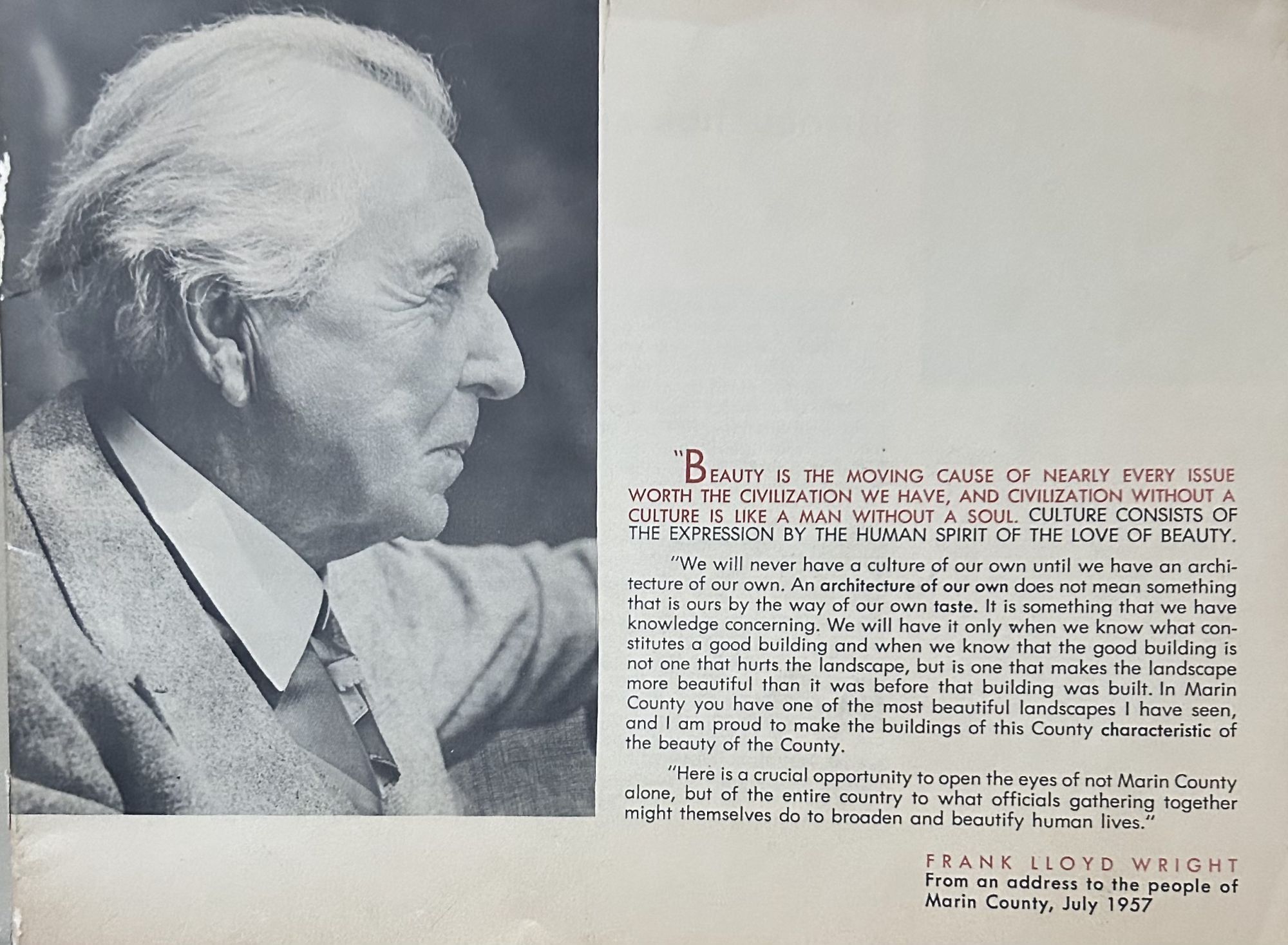 Marin County: Marin County Civic Center, 1957. Stiff Wraps. Orig. stiff wraps. 28 pages. 20 x 27 cm. Printed in red and black with black and white and color plates. Wright's dedication and introduction to the founding of the center and detailed analysis of all the components of the Civic Center. Plans and commentary on the construction.