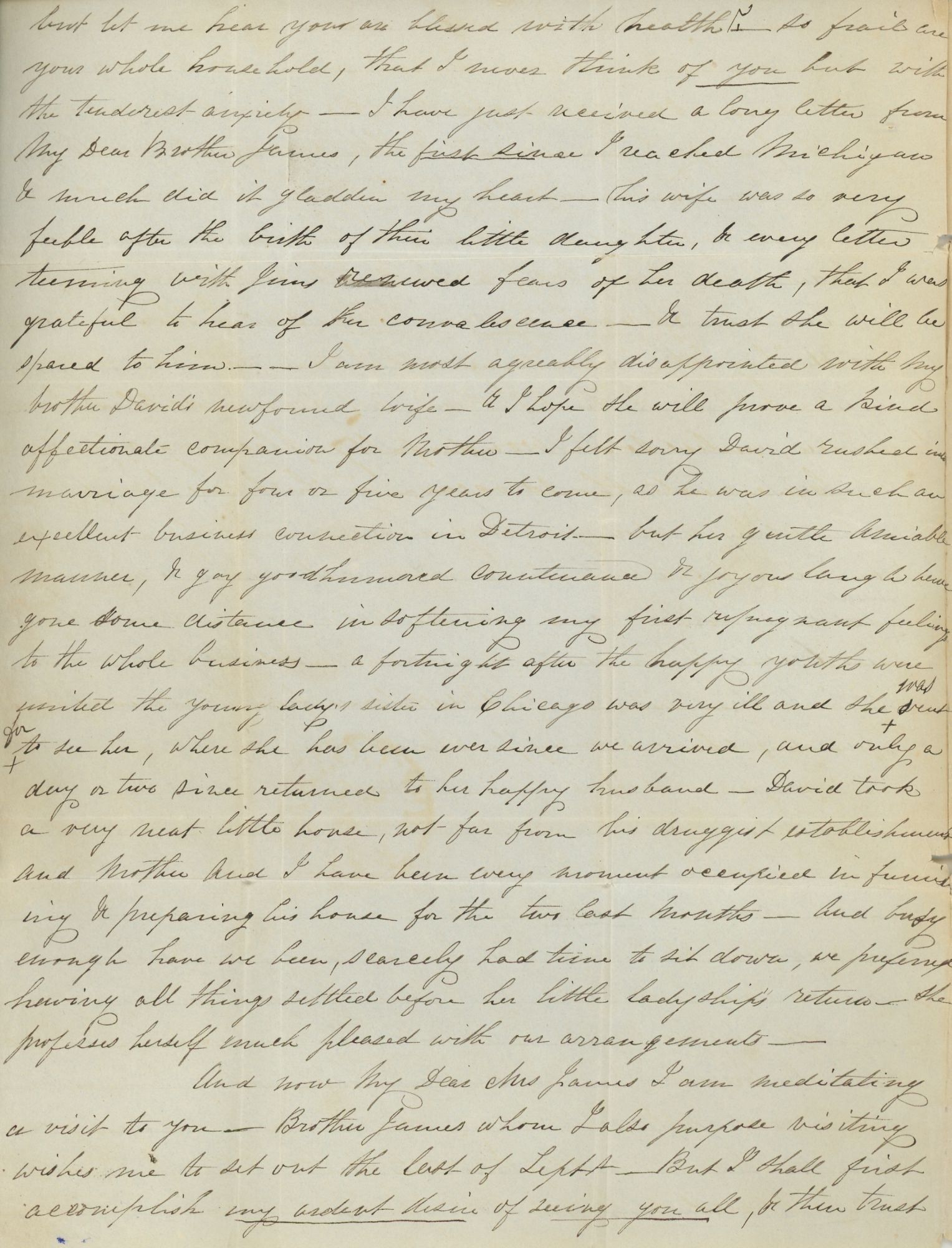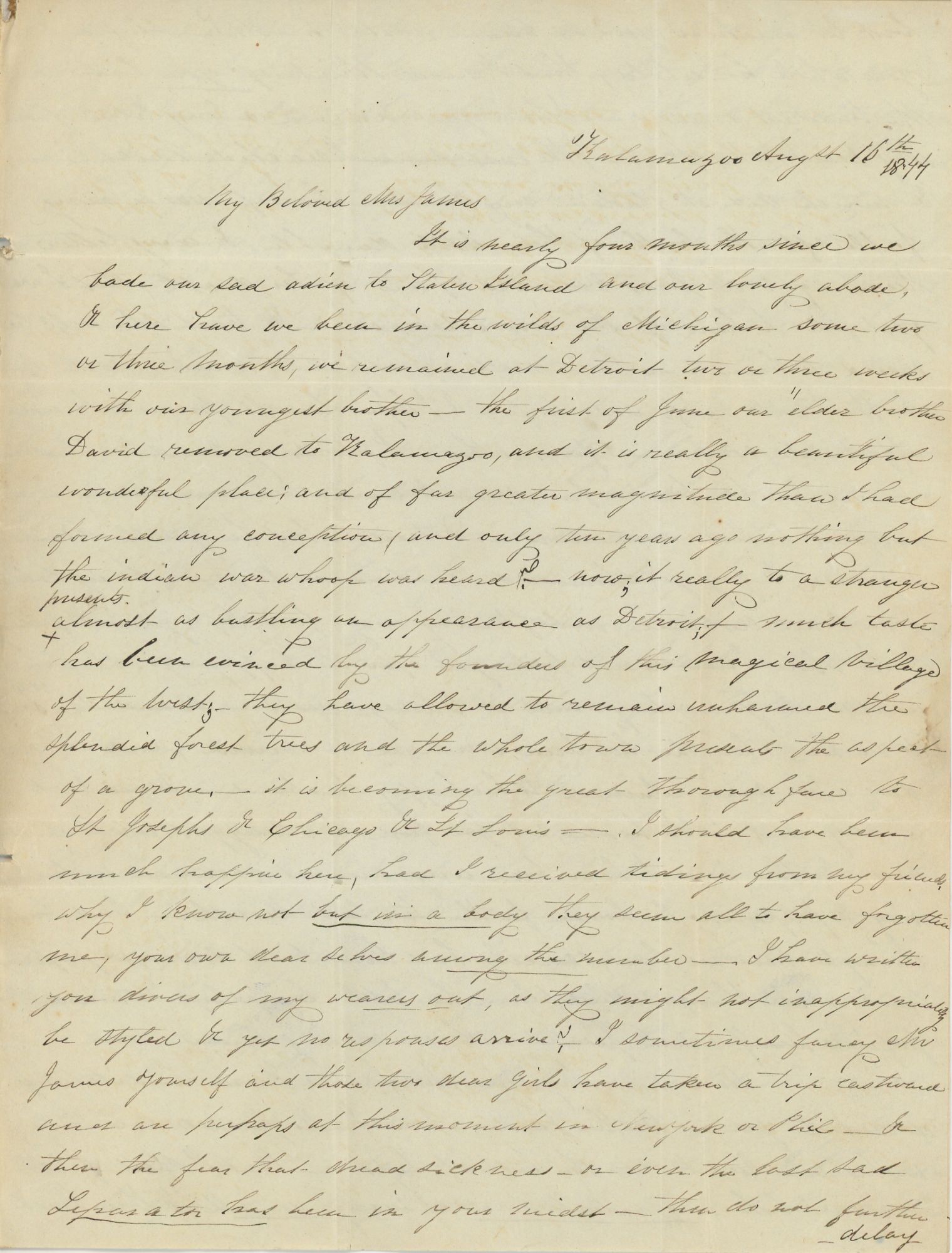 “It is nearly four months since we bade our sad adieu to Staten Island and our lovely abode, & here have we been in the wilds of Michigan some two or three months, we remained at Detroit two or three weeks with our youngest brother — the first of June our elder brother David removed to Kalamazoo, and it is really a beautiful wonderful place; and of far greater magnitude than I had formed any conception, and only ten years ago nothing but the indian war whoop was heard — now, it really to a stranger presents almost as bustling an appearance as Detroit; + much taste has been evinced by the founders of this magical village of the west; – they have allowed to remain unharmed the splendid forest trees and the whole town presents the aspect of a grove, — it is becoming the great thoroughfare to St Josephs & Chicago & St Louis —.”