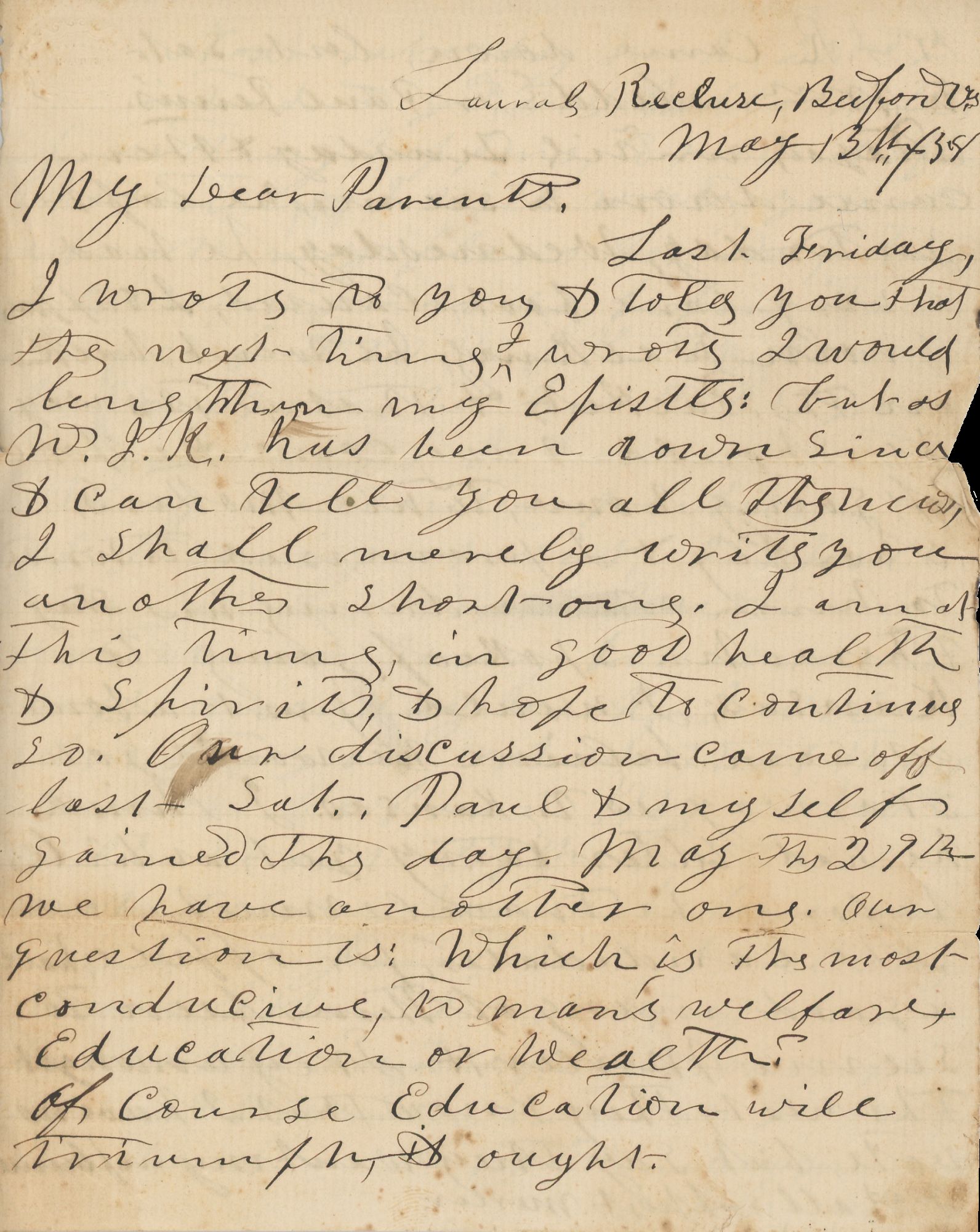 Minor “gained the day” on the debate, and was preparing for the next: “Which is the most conducive, to man’s welfare, education or wealth? Of course Education will triumph; it ought” (May 13, 1858).