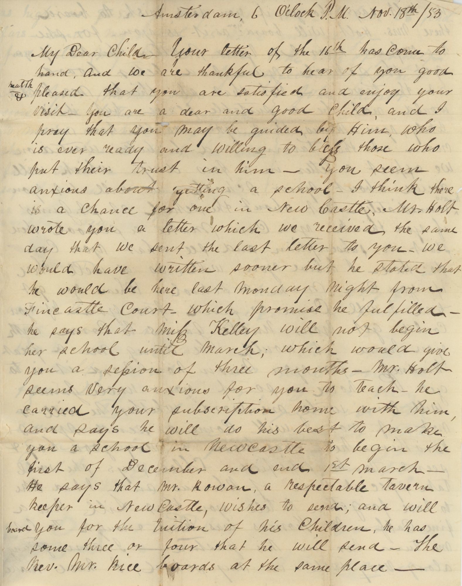 “You seem anxious about getting a school. I think there is a chance for one in New Castle, Mr. Holt wrote you a letter which we received the same day that we sent the last letter to you. We would have written sooner but he stated that he would be here last Monday night from Fincastle Court – which promise he fulfilled – he says that Miss Kelley will not begin her school until March; which would give you a session of three months. Mr. Holt seems very anxious for you to teach – he carried your subscription home with him, and he says he will do his best to make you a school in Newcastle to begin the first of December and end 1st March — He says that Mr. Rowan, a respectable tavern keeper in New Castle, wishes to send; and will board you for the tuition of his children.” (November 18, 1853)