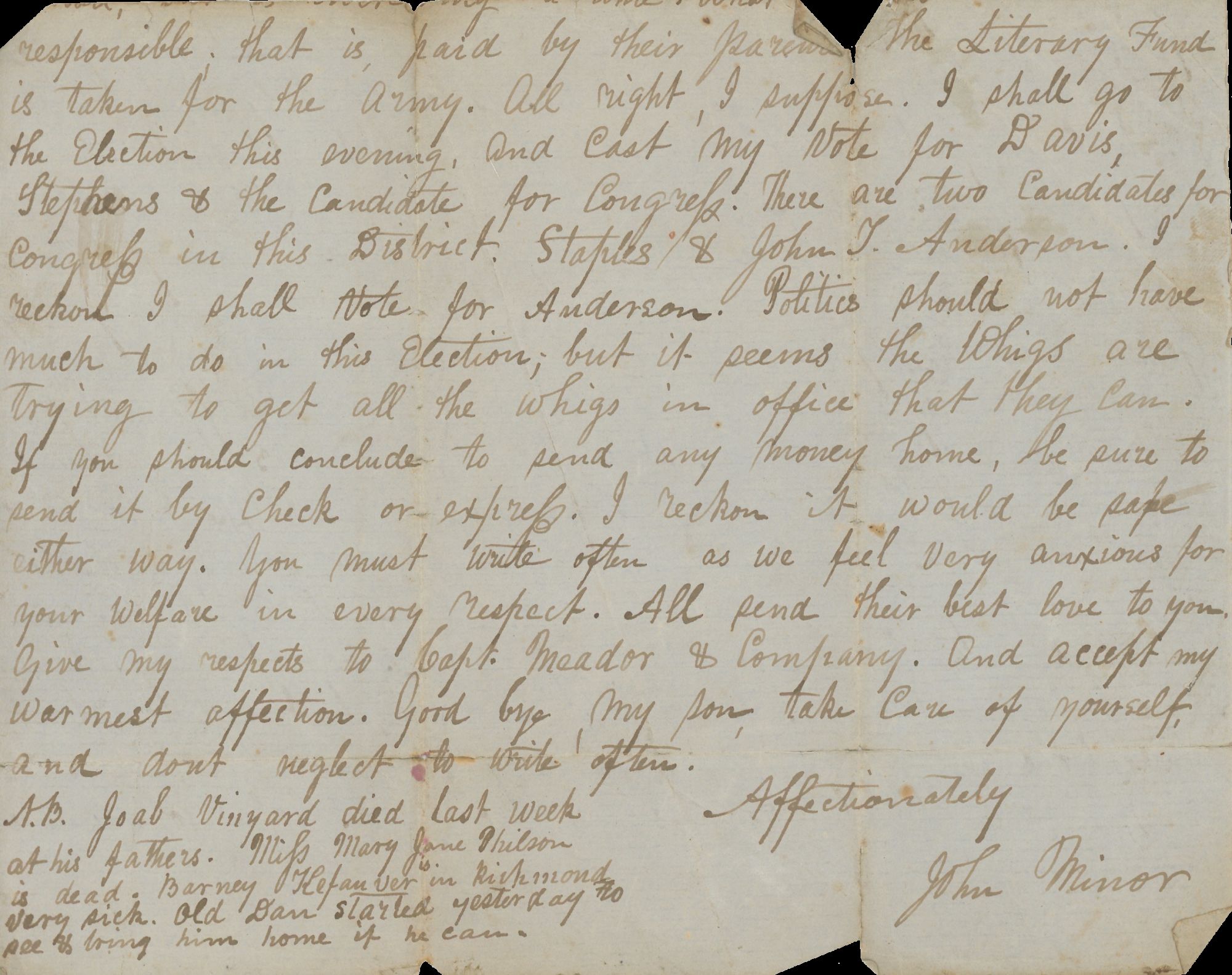 “You are enlisted in a good & great cause; the defence of your Country & your family. [...] We have, as usual, [heard] a good many rumors about battles in different places but not much reliable. It is rumoured that 30000 Yankees have gone along the Coast of N. Carolina. I expect we shall have hot work in the south if that be so. Some of the Roanoke Greys have returned home sick. Wm Watts came home last week, but was not very sick. Robert Vineyard also came home last week. He is not home, but riding about; and looks very well, but is very hoarse & has been so for a good while. He has a discharge. [...] I shall go to the Election this evening, and cast my vote for Davis, Stephens & the Candidate for Congress [...] I reckon I shall vote for Anderson. Politics should not have much to do in this Election; but it seems the Whigs are trying to get all the Whigs in office they can.” (N.d., likely 1861)