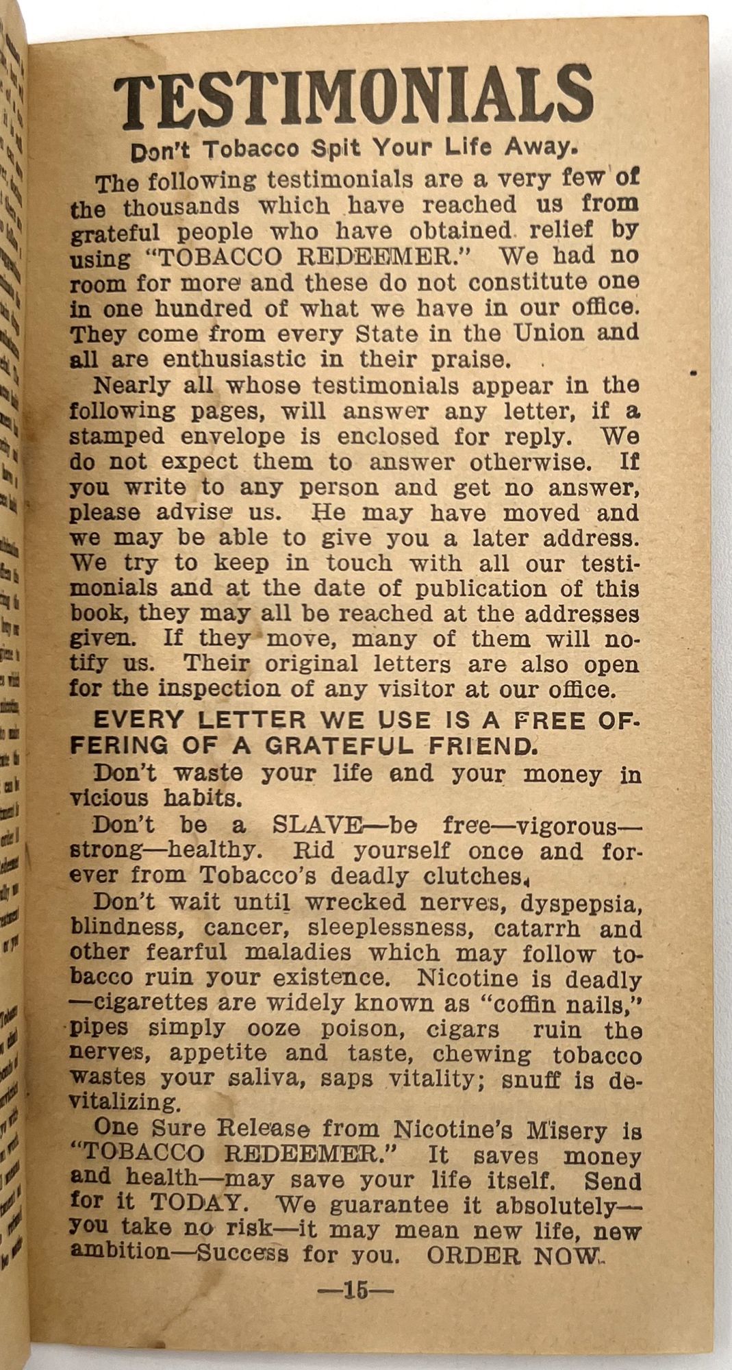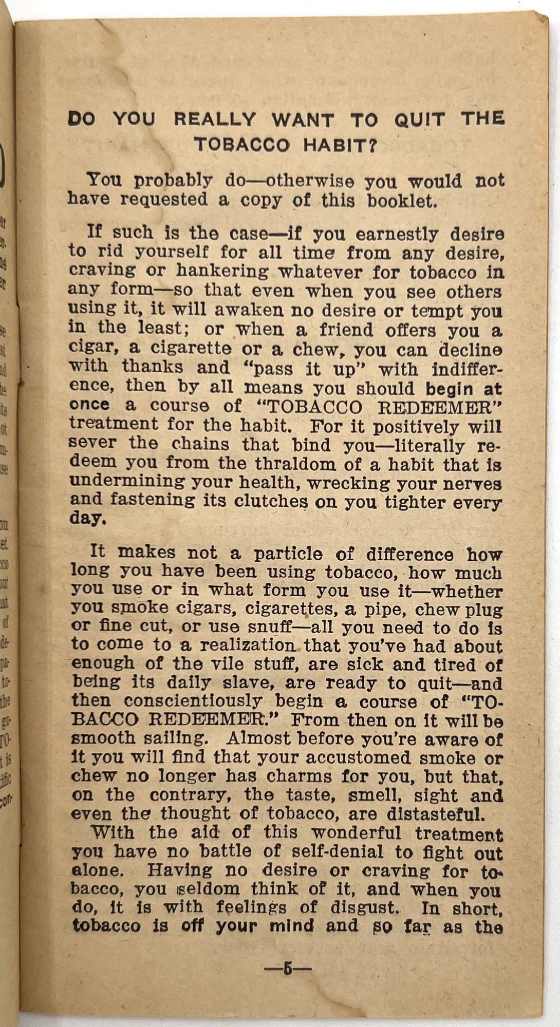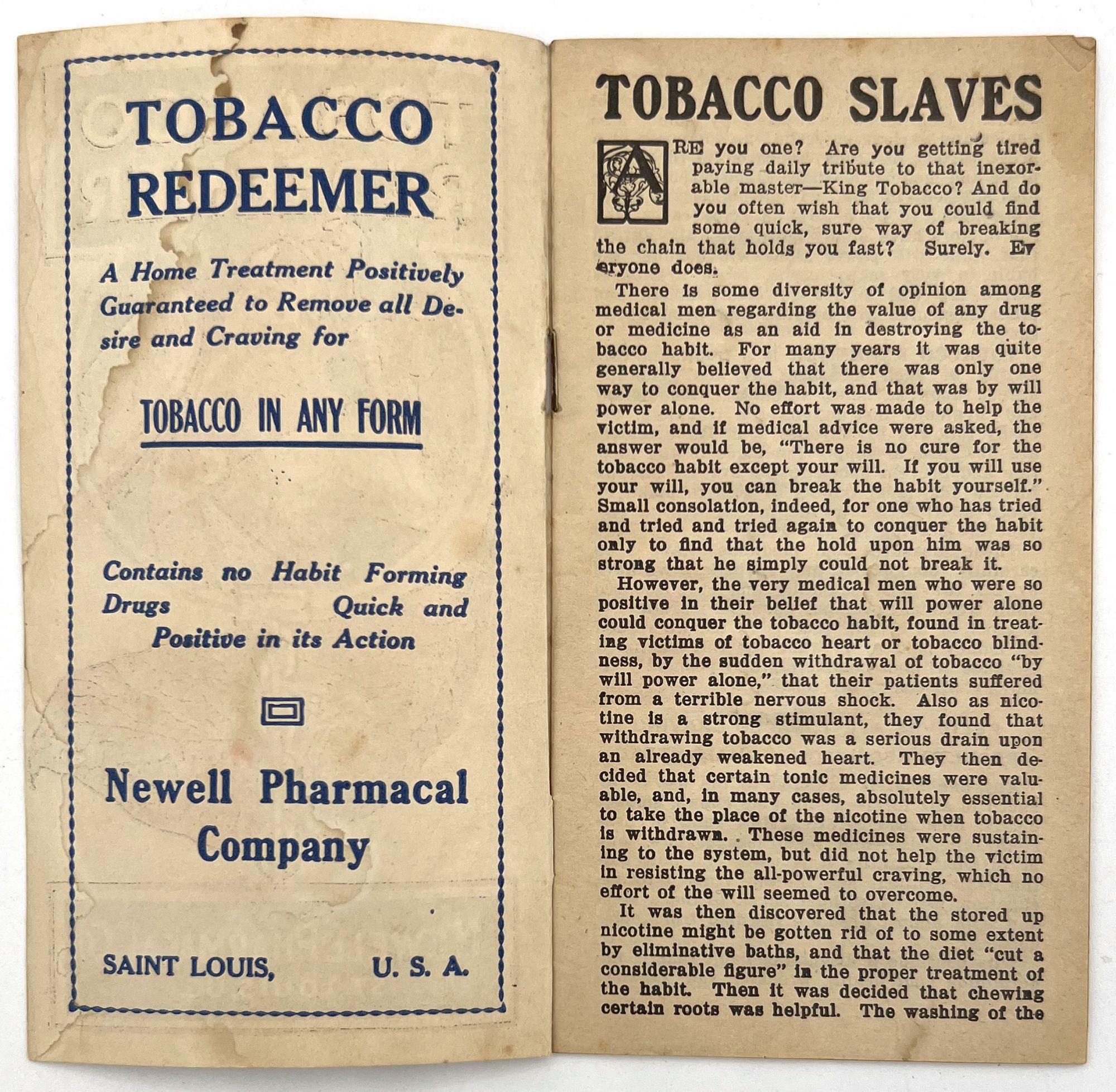 St. Louis, Missouri: Newell Pharmacal Company, 1920. Good. Light toning, water staining and dust soiling, minor rust staining from staples.. A printed booklet promoting a "home remedy positively guaranteed to remove all desire and craving for tobacco in any form" (i.e. a cure for tobacco addiction). The booklet begins: "Tobacco Slaves. Are you one? Are you getting tired paying daily tribute to that inexorable master-- King Tobacco? And do you often wish that you could find some quick, sure way of breaking the chain that holds you fast?" (p. [1]). Provides fascinating insight into how people spoke about addiction at the time, insisting it was a "habit" and not a "disease", while at the same time prescribing a medical cure/treating it like a disease to be cured. Also includes testimonials for the treatment, which appears to be a powder and lozenge. Single vol. (6.25" by 3.25"), pp. 24, in original illus. wrps with image of a warrior and a tobacco leaf on the front.