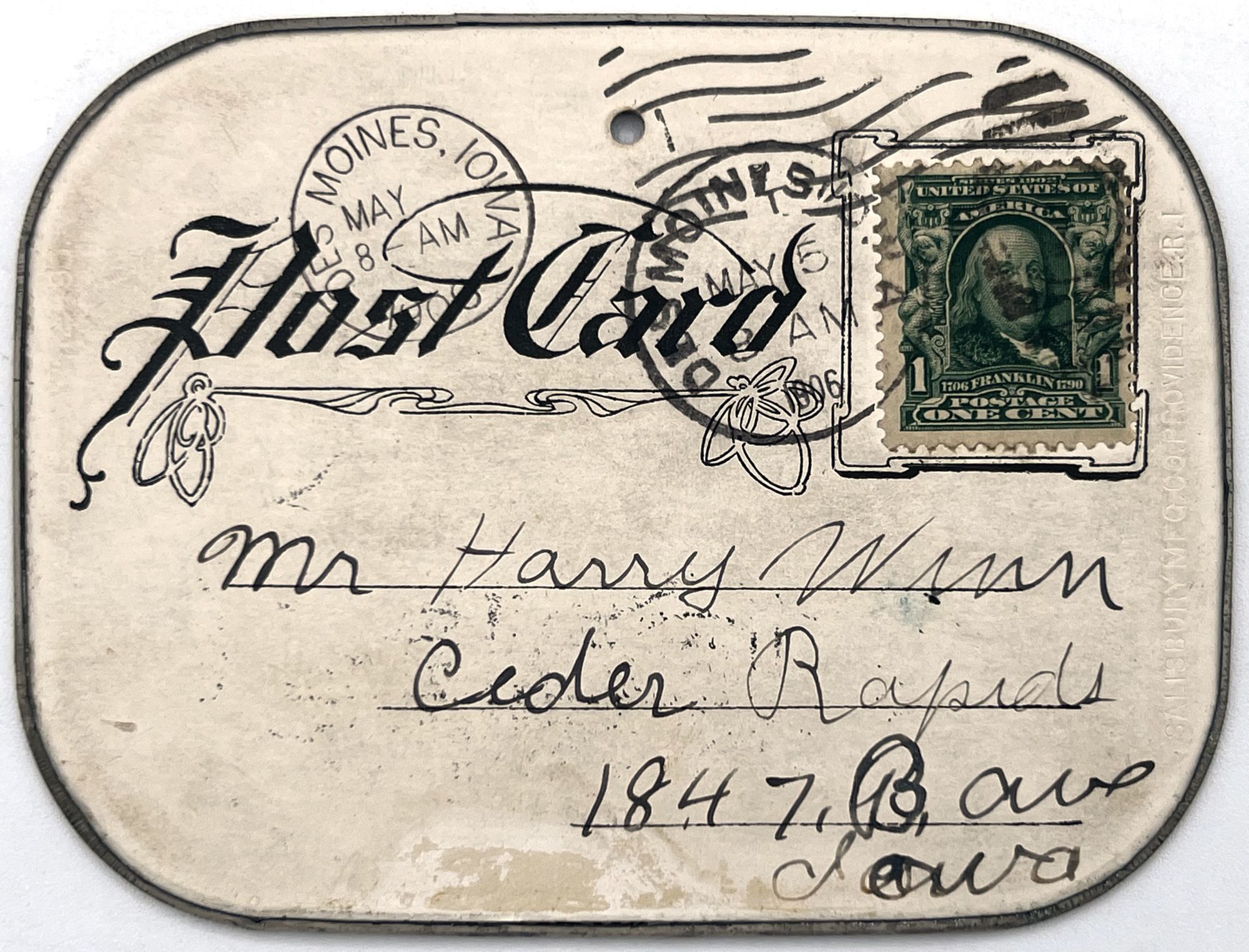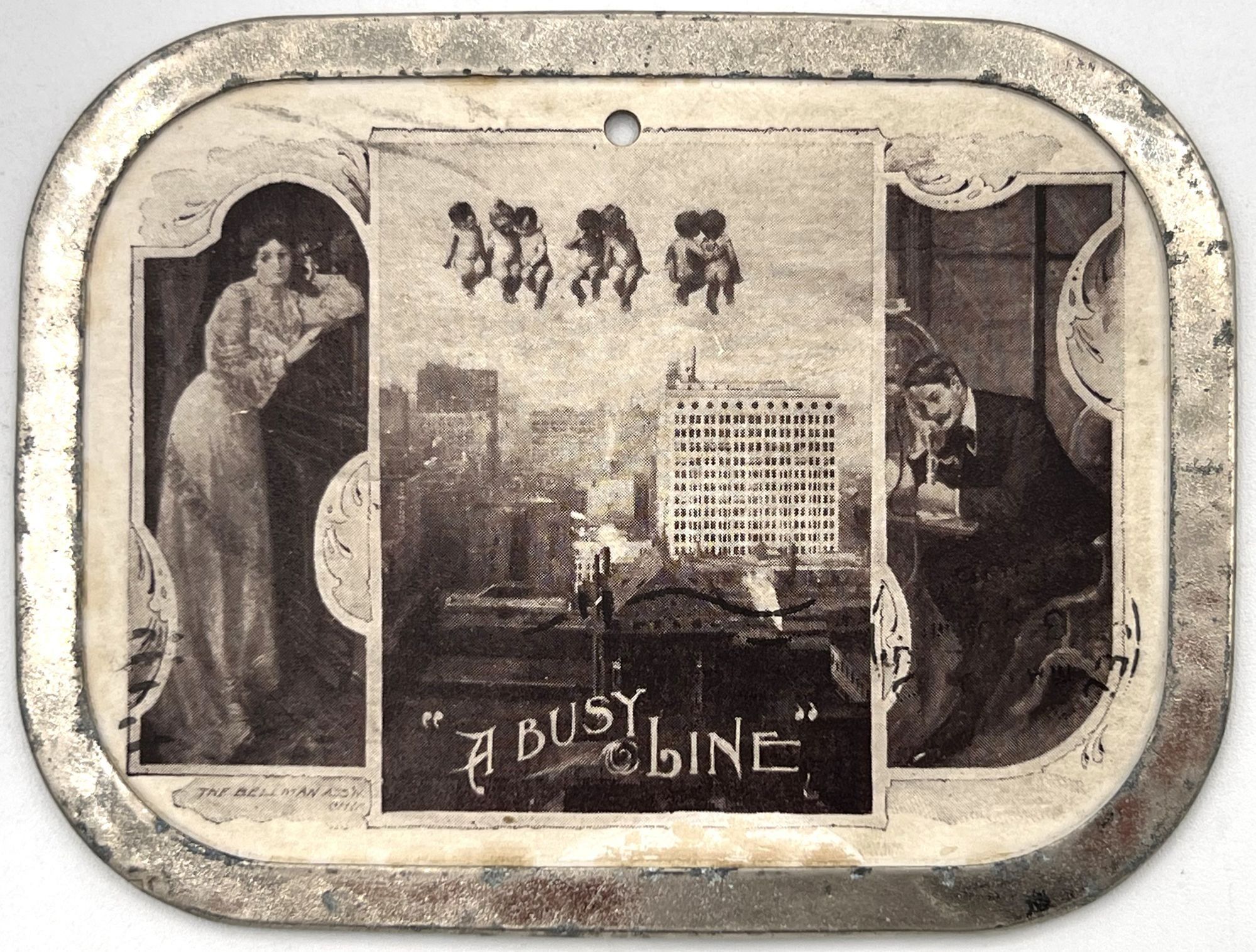 Providence, Rhode Island: Salisbury Manufacturing Co. / Bellman Ass'n, 1906. Very good. Minor tarnishing or wear to metal, light dust soiling.. A novelty postcard from 1906, illustrating a handsome young couple on the telephone. The caption reads "A Busy Line", and the central image shows a group of putti perched on the telephone wire connecting the two lovers. Measures approx. 3" by 4" with rounded corners, small hole at head for display, and metal trim around the outside of the card (probably aluminum). Hand addressed in contemporary ink with 1c stamp and May 1906 postmark from Des Moines, Iowa.