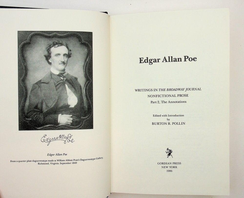 "The Collected Works of Edgar Allan Poe (edited by Thomas Ollive Mabbott, Poems, Tales and Sketches — the definitive annotated scholarly edition of Poe’s poetry, tales and sketches). The series long planned by Mabbott was continued after his death as The Collected Writings of Edgar Allan Poe (chiefly edited by Burton R. Pollin), including The Imaginary Voyages (The Narrative of Arthur Gordon Pym, The Journal of Julius Rodman and The Adventures of Hans Phaall), The Brevities (including “Marginalia,” “Pinakidia,” etc.), Nonfictional Prose in the Broadway Journal and Nonfictional Prose in the Southern Literary Messenger. Two additional volumes were issued on Eureka and Edgar Allan Poe, Critical Theory: The Major Writings (edited by Stuart and Susan Levine). " (The Edgar Allan Poe Society
