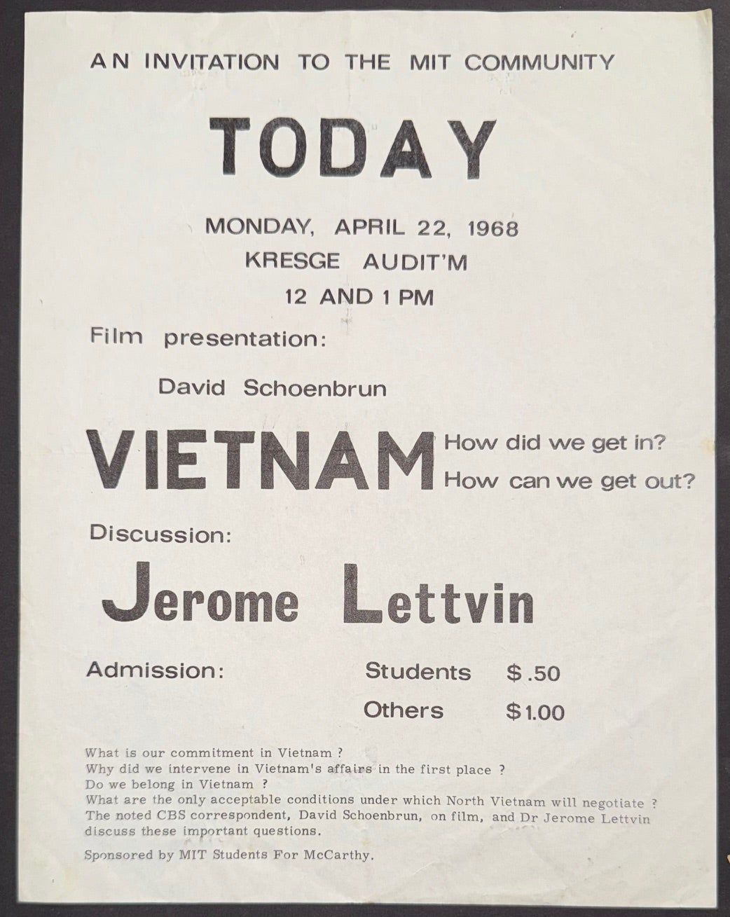 An invitation to the MIT community. Today... Film presentation: David Schoenbrun. Vietnam: How did we get in? How can we get out? [handbill]