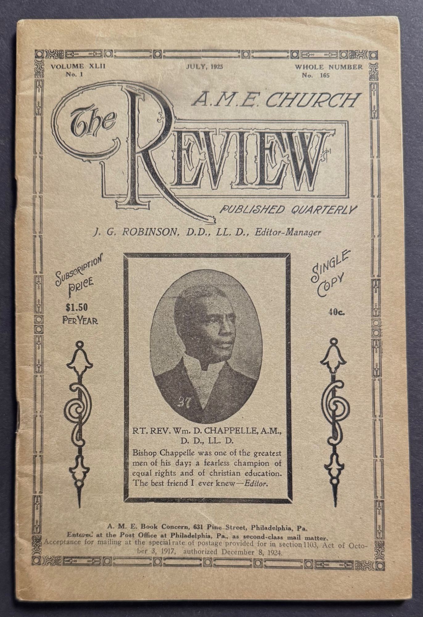 Philadelphia: AME Book Concern, 1925. pp. [225]-285, staplebound journal, minor edgewear, very good. Edited by J.G. Robinson. Cover depicts Rev. William D. Chapelle, for whom a eulogy is included in this issue. Contributions include theological discussion of overcoming racial prejudice, a report on the Church in the Virgin Islands, biographical briefs, and much more.