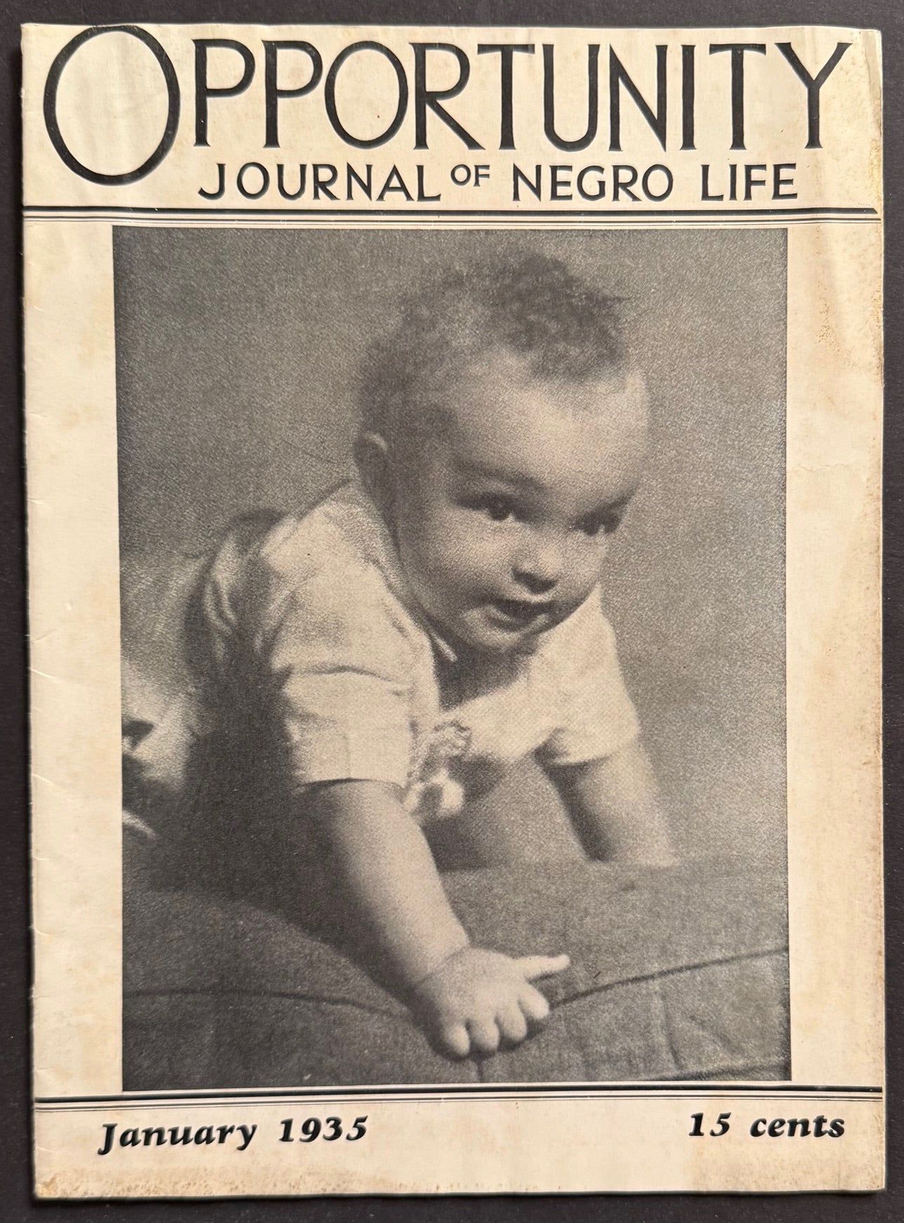 New York: National Urban League, 1935. Single issue of the staplebound magazine; 30p., minor wear and soil to covers. 8.5x11 inches. Includes sketches by Romare Bearden of the Eighth Avenue Market. The baby on the cover is Monroe Davis Dowling, Jr., who grew up to study chemistry at Harvard University and medicine at Howard University; he became a prominent oncologist.
