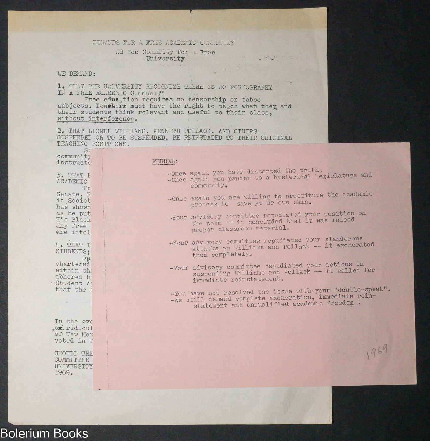 Albuquerque, NM: Ad Hoc Committee for a Free University, 1969. Ephemera. 8.5x11 inch handbill, printed on both sides + half-sheet on pink paper. Browned strip at head of 8.5x11 inch sheet; minor creasing to lower right corners of both sheets, otherwise Very Good. Two documents from a campus group at the University of New Mexico in support of Lionel Williams, an English instructor suspended for the use in instruction of the Lenore Kandel poem “Love Lust," with its graphic description of oral sex. Williams, an African American educator, was suspended, as were others in the English department. The handbills demand their reinstatement and call on university president Ferrel Heady to cease investigation of faculty and students and exonerate all affected or face a student strike. Williams was suspended and tried in court, but ultimately cleared of wrong-doing and reinstated.