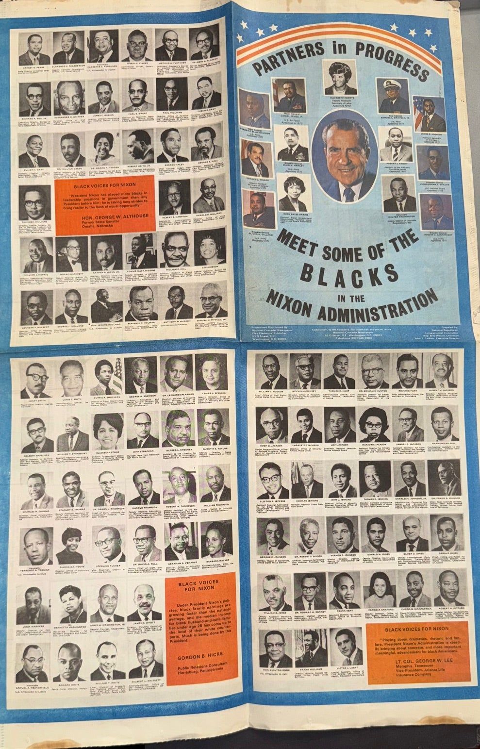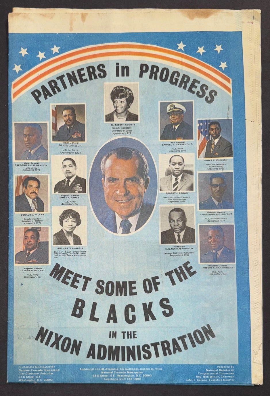 Washington: National Crusader Newspaper, 1972. Brochure folded like a newspaper, unfolding to to 25x46 inches for full display. One side contains eight panels showing President Nixon and over 200 African Americans serving in his administration (most prominently featured are military figures); the other side is a full-size wall chart promoting Nixon's civil rights record. Some edge stains at top.