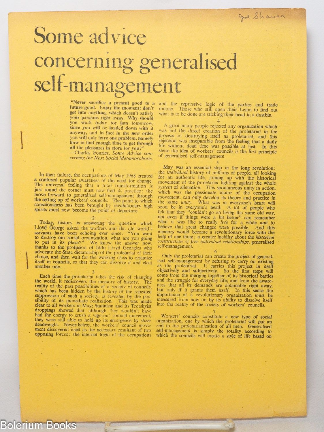 London: Spontaneous Combustion, 1969. [4]p., stapled wraps, 8.25x11.75 inches, fold-creased, wraps toned and worn along edges, previous owner's name penned on front wrap, else good condition. Reprinted from S.I. No. 12, 1969.