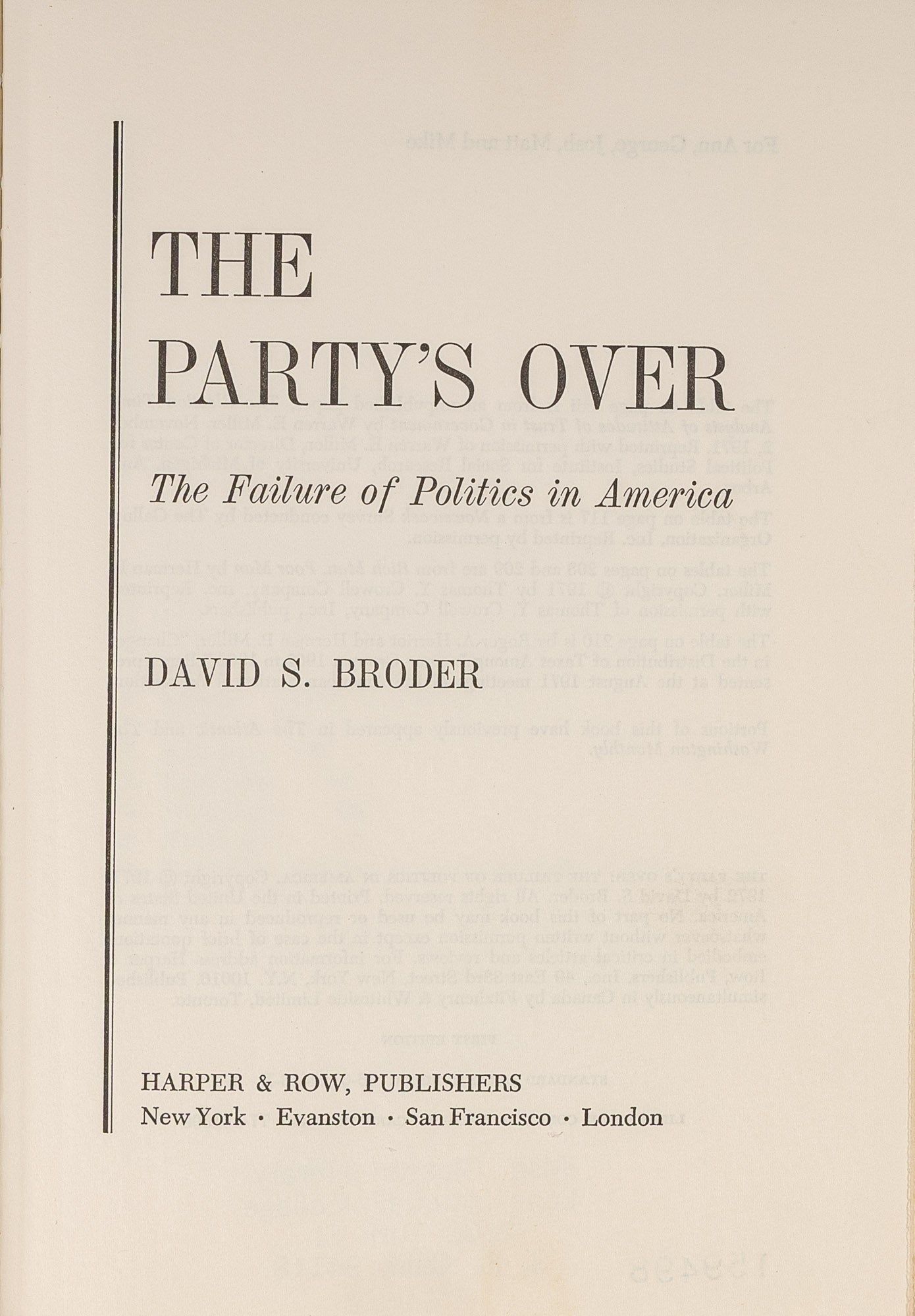 1972. Broder, David S. The Party's Over: The Failure of Politics in America. New York, Harper & Row. 1st ed. 1972. xxv, 280 pp. Original blue cloth with red stamped spine and front cover. Tape residue to boards and jacket. Ex-library with bookplate to front pastedown, library stamp to verso of title date due slip to rear free endpaper, card pocket to rear pastedown. Location label to foot of dust jacket spine, else jacket very good. Good. $10. * Contents: Eisenhower; Kennedy; Johnson; Nixon; Opinion; Needs -- Reforms; Leadership; Realignment; Mechanisms; Conclusion: partakers in the government.